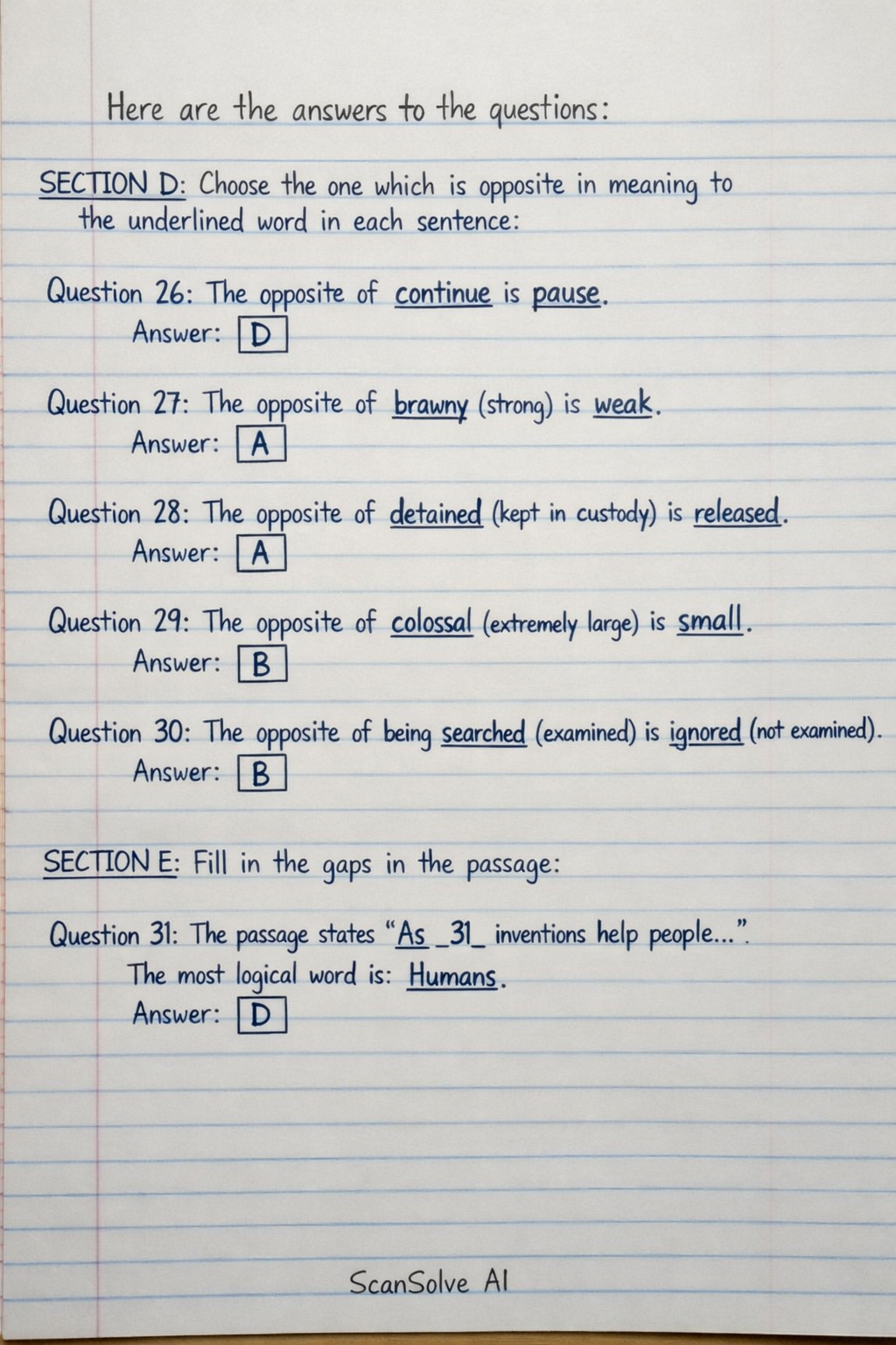 SECTION D: Choose the one which is opposite in meaning to the underlined word in each sentence.