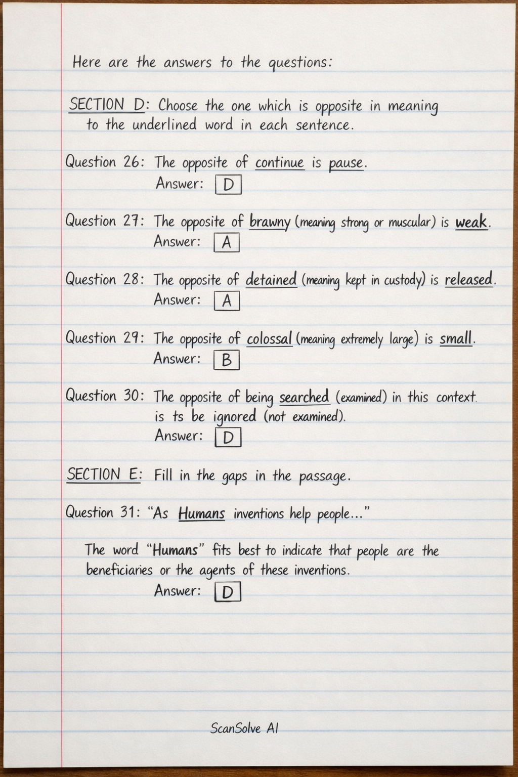 SECTION D: Choose the one which is opposite in meaning to the underlined word in each sentence.