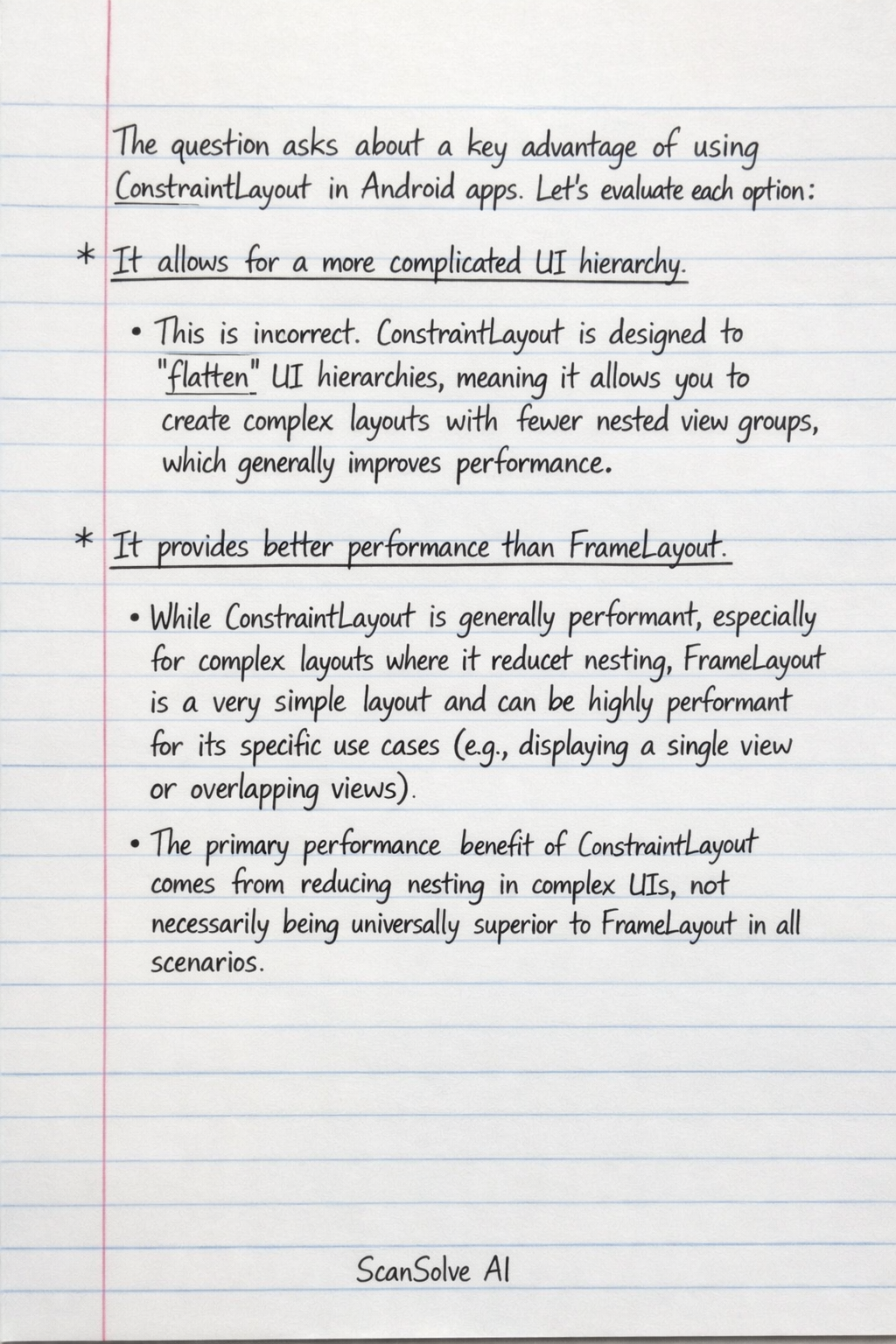The question asks about a key advantage of using ConstraintLayout in Android apps. Let's evaluate each option: