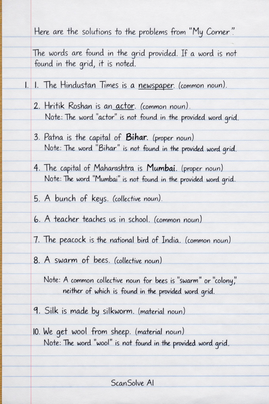 Find common nouns, proper nouns, collective nouns and material nouns from the word grid with the help of the given clues.