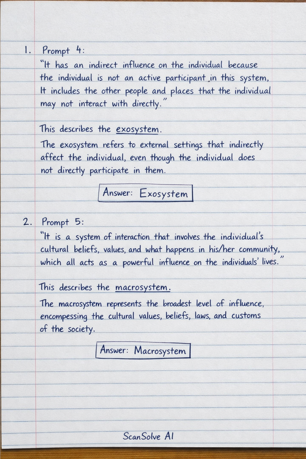 Which of the following best describes a macrosystem? It has an indirect influence on the individual because the individual is not an active participant in this system, it includes the other people and places that the individual may not interact with directly. OR It is a system of interaction that involves the individual's cultural beliefs, values and what happens in his/her community, which all acts as a powerful influence on the individuals' lives.