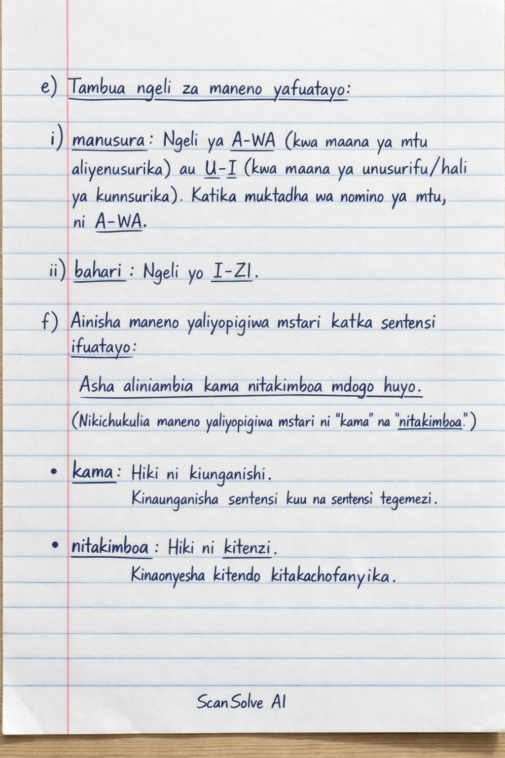Ambia ngeli za maneno yafuatayo: i) manusura... ii) bahari... f) Ainisha maneno yaliyopigiwa mstari katika sentensi ifuatayo: Asha aliniambia kama nitakimbia ndio hizo nitakapompa nani. g) Kanusha sentensi ifuatayo kwa wingi: Mimi ndimi mtangazaji bora. h) Tumia mofimu hizi- katika sentensi hamna nani