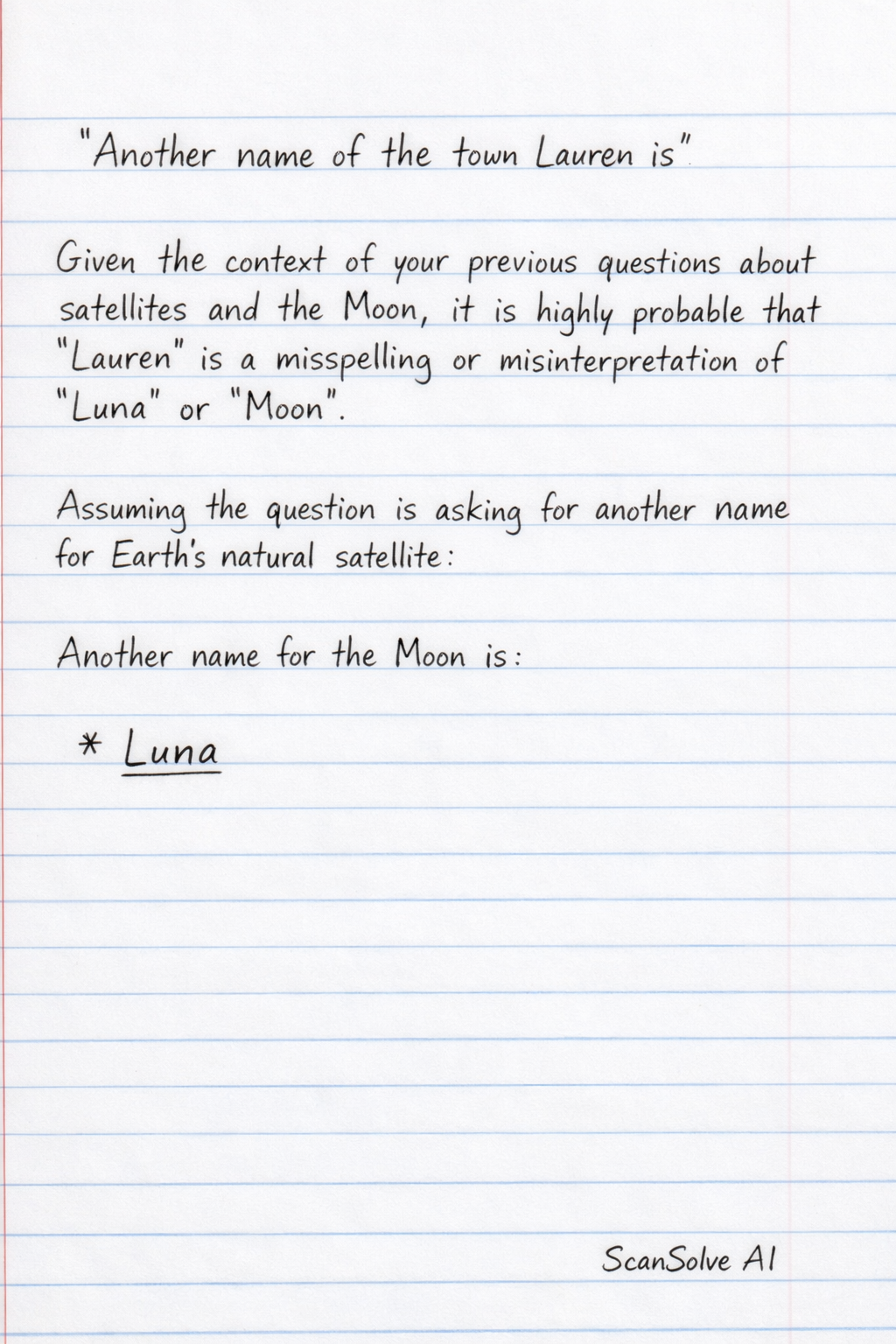Given the context of your previous questions about satellites and the Moon, it is highly probable that "Lauren" is a misspelling or misinterpretation of "Luna" or "Moon". Assuming the question is asking for another name for Earth's natural satellite: