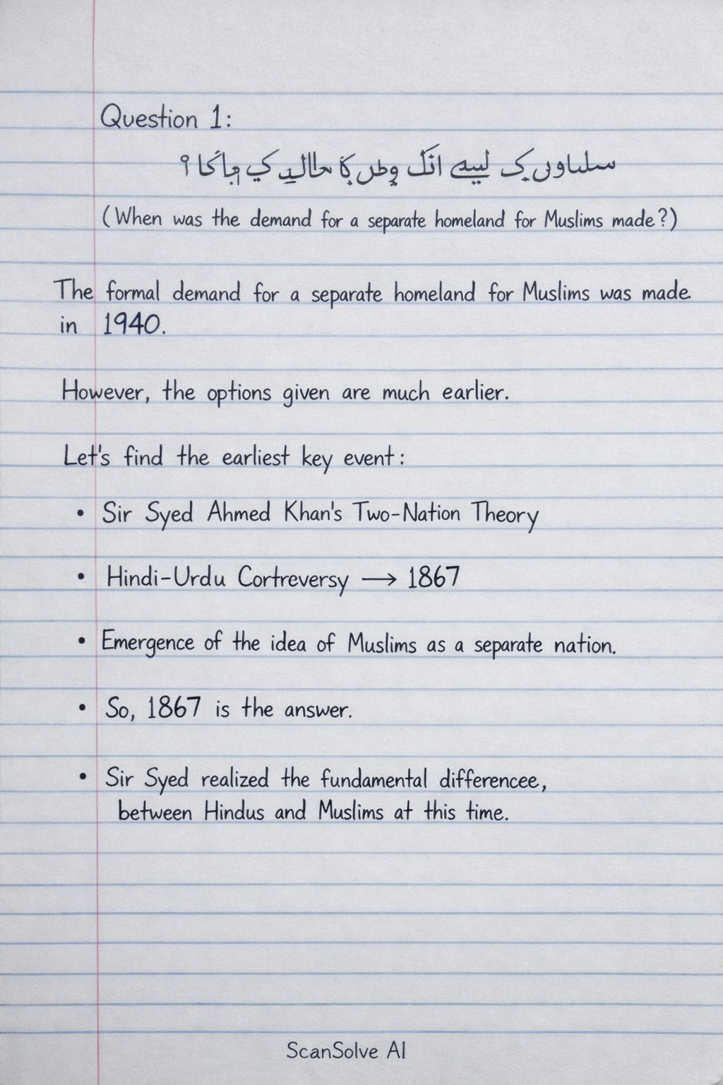 The formal demand for a separate homeland for Muslims (Pakistan Resolution) was made in 1940. However, the options provided are much earlier. The question likely refers to the earliest conceptualization or a significant event that laid the groundwork for this demand. Sir Syed Ahmed Khan's two-nation theory, which articulated the idea of Muslims as a separate nation, began to emerge around the time of the Hindi-Urdu controversy in 1867. This event is often cited as the point where Sir Syed realized the fundamental differences between Hindus and Muslims,