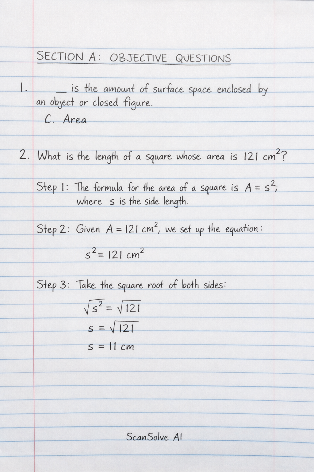 2. What is the length of a square whose area is $121 \text{cm}^2$?