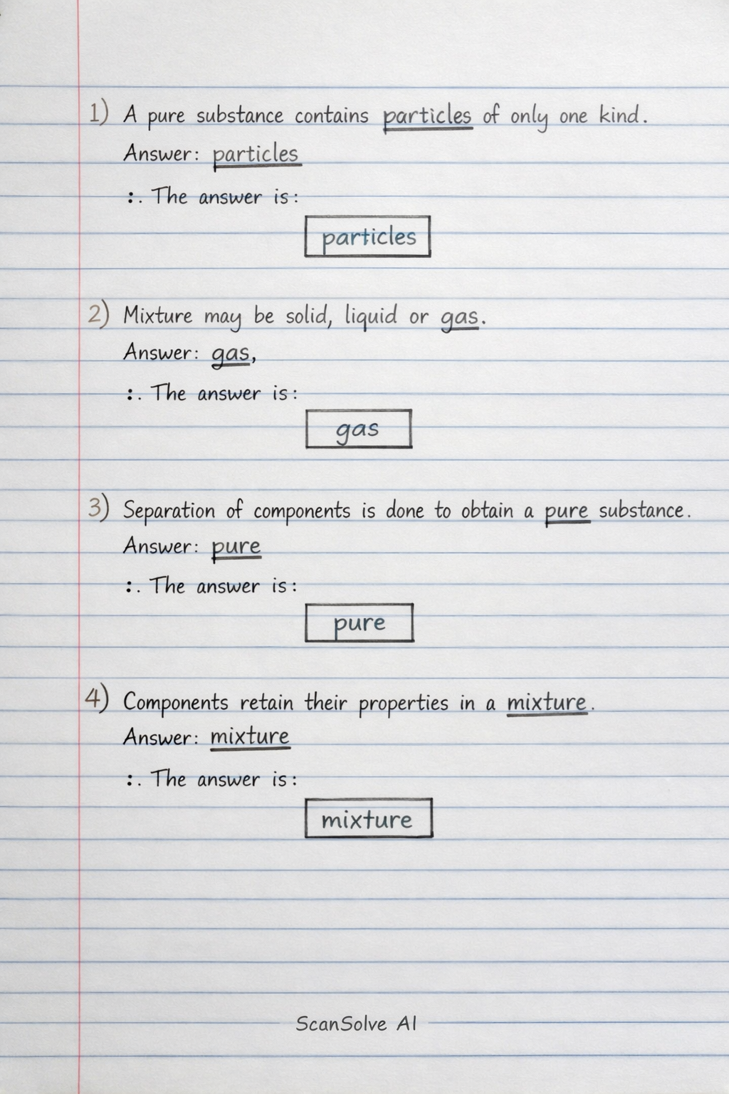 Fill in the blanks with the correct words: A pure substance contains.......of only one kind. Mixture may be sold, liquid or ....... Separation of components is done to obtain a ....... substance. Components retain their properties in a .......