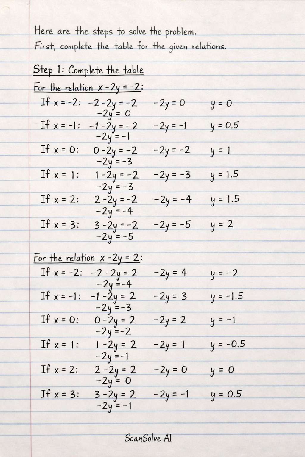 - If x=3: 3−2y=−2⟹−2y=−5⟹y=2.5