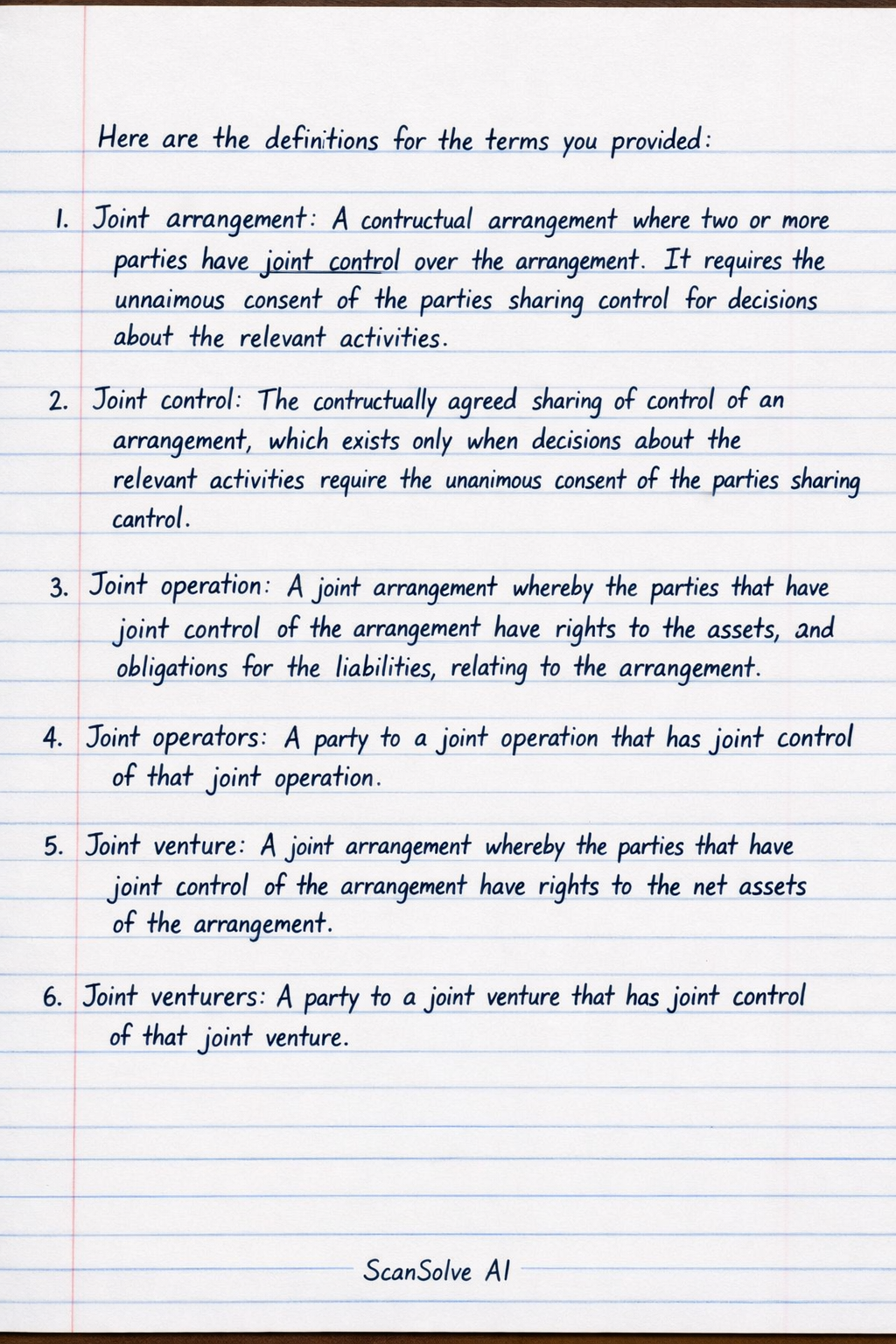 1. Joint arrangement: A contractual arrangement where two or more parties have joint control over the arrangement.