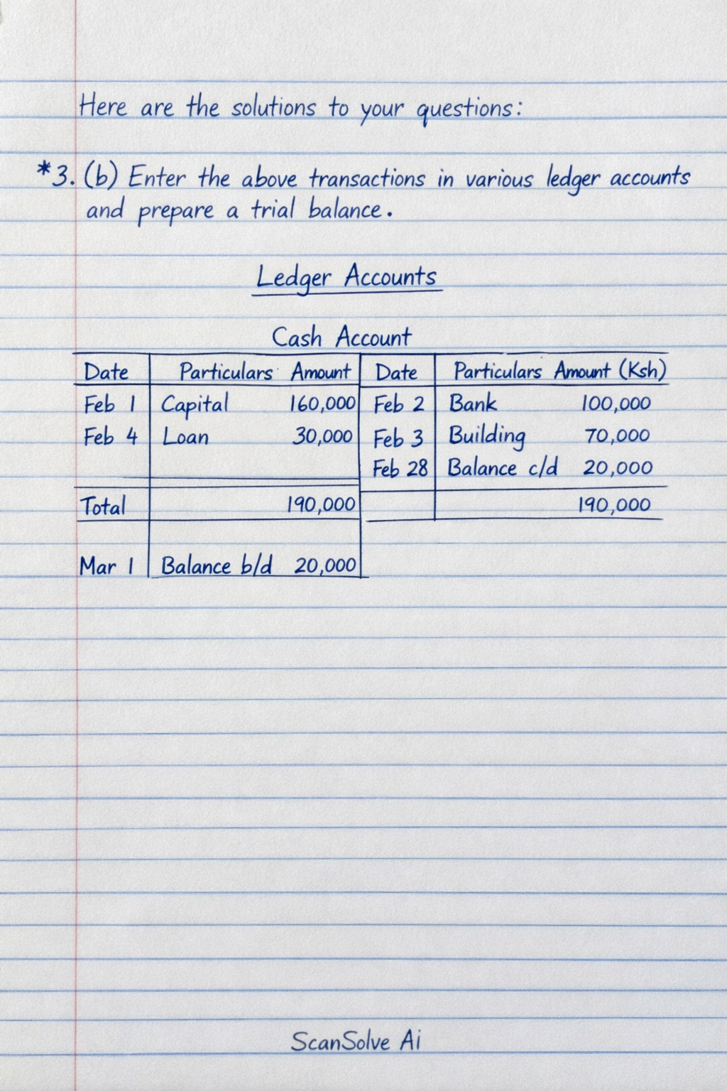 Here are the solutions to your questions: 3. (b) Enter the above transactions in various ledger accounts and prepare a trial balance. Ledger Accounts Cash Account |l|l|r|l|l|r| Date & Particulars & Amount (Ksh) & Date & Particulars & Amount (Ksh) \\ Feb 1 & Capital & 160,000 & Feb 2 & Bank & 100,000 \\ Feb 4 & Loan & 30,000 & Feb 3 & Building & 70,000 \\ & & & Feb 28 & Balance c/d & 20,000 \\ & Total & 190,000 & & Total & 190,000 \\ Mar 1 & Balance b/d & 20,000 & & & \\ Bank Account |l|l|r|l|l|r| Date & Particulars & Amount (Ksh) & Date & Particulars & Amount (Ksh) \\ Feb 2 & Cash & 100,000 & Feb 5 & Purchases & 7,000 \\ & & & Feb 6 & Loan & 20,000 \\ & & & Feb 28 & Balance c/d & 73,000 \\ & Total & 100,000 & & Total & 100,000 \\ Mar 1 & Balance b/d & 73,000 & & & \\ Capital Account |l|l|r|l|l|r| Date & Particulars & Amount (Ksh) & Date & Particulars & Amount (Ksh) \\ Feb 28 & Balance c/d & 160,000 & Feb 1 & Cash & 160,000 \\ & Total & 160,000 & & Total & 160,000 \\ & & & Mar 1 & Balance b/d & 160,000 \\ Building Account |l|l|r|l|l|r| Date & Particulars & Amount (Ksh) & Date & Particulars & Amount (Ksh) \\ Feb 3 & Cash & 70,000 & Feb 28 & Balance c/d & 70,000 \\ & Total & 70,000 & & Total & 70,000 \\ Mar 1 & Balance b/d & 70,000 & & & \\ Loan Account |l|l|r|l|l|r| Date & Particulars & Amount (Ksh) & Date & Particulars & Amount (Ksh) \\ Feb 6 & Bank & 20,000 & Feb 4 & Cash & 30,000 \\ Feb 28 & Balance c/d & 10,000 & & & \\ & Total & 30,000 & & Total & 30,000 \\ & & & Mar 1 & Balance b/d & 10,000 \\ Purchases Account |l|l|r|l|l|r| Date & Particulars & Amount (Ksh) & Date & Particulars & Amount (Ksh) \\ Feb 5 & Bank & 7,000 & Feb 28 & Balance c/d & 7,000 \\ & Total & 7,000 & & Total & 7,000 \\ Mar 1 & Balance b/d & 7,000 & & & \\ Debtors Account (Accounts Receivable) |l|l|r|l|l|r| Date & Particulars & Amount (Ksh) & Date & Particulars & Amount (Ksh) \\ Feb 6 & Sales & 1,500 & Feb 28 & Balance c/d & 1,500 \\ & Total & 1,500 & & Total & 1,500 \\ Mar 1 & Balance b/d & 1,500 & & & \\ Sales Account |l|l|r|l|l|r| Date & Particulars & Amount (Ksh) & Date & Particulars & Amount (Ksh) \\ Feb 28 & Balance c/d & 1,500 & Feb 6 & Debtors & 1,500 \\ & Total & 1,500 & & Total & 1,500 \\ & & & Mar 1 & Balance b/d & 1,500 \\ Trial Balance as at February 28, 2022 |l|r|r| Account Name & Debit (Ksh) & Credit (Ksh) \\ Cash & 20,000 & \\ Bank & 73,000 & \\ Capital & & 160,000 \\ Building & 70,000 & \\ Loan & & 10,000 \\ Purchases & 7,000 & \\ Debtors & 1,500 & \\ Sales & & 1,500 \\ Total & 171,500 & 171,500 \\ 4. (a) Explain five current trends in product promotion. • Digital Marketing: This involves using online channels such as social media, search engines, email, and websites to promote products and reach target audiences. • Influencer Marketing: Businesses collaborate with individuals who have a significant following and credibility in a specific niche to endorse or promote their products. • Content Marketing: This trend focuses on creating and distributing valuable, relevant, and consistent content (like blogs, videos, or infographics) to attract and retain a clearly defined audience. • Personalization: Promotional messages and offers are tailored to individual customers based on their data, preferences, and past behavior, making promotions more relevant. • Experiential Marketing: This involves creating immersive and interactive brand experiences, such as pop-up shops, events, or virtual reality experiences, to engage customers directly. 4. (b) Explain five features of money as a medium of exchange. • Acceptability: Money must be generally accepted by everyone in an economy as a means of payment for goods and services. • Divisibility: Money should be easily divisible into smaller units without losing its value, allowing for transactions of varying amounts. • Portability: Money should be easy to carry and transport, making it convenient for people to use in daily transactions. • Durability: Money must be able to withstand wear and tear from frequent handling and last for a reasonable period without deteriorating. • Scarcity: Money must be limited in supply to maintain its value and prevent inflation, ensuring it remains a reliable store of value. 3 done, 2 left today. You're making progress.