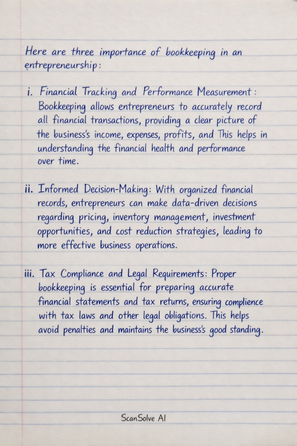 i. Financial Tracking and Performance Measurement: Bookkeeping allows entrepreneurs to accurately record all financial transactions, providing a clear picture of the business's income, expenses, profits, and losses. This helps in understanding the financial health and performance over time.