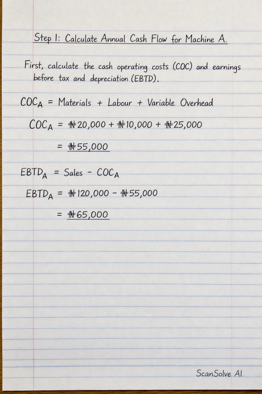 Step 1: Calculate Annual Cash Flow for Machine A.