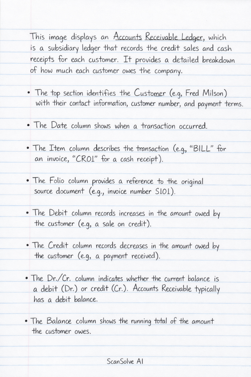 This image displays an Accounts Receivable Ledger, which is a subsidiary ledger that records the credit sales and cash receipts for each customer. It provides a detailed breakdown of how much each customer owes the company.