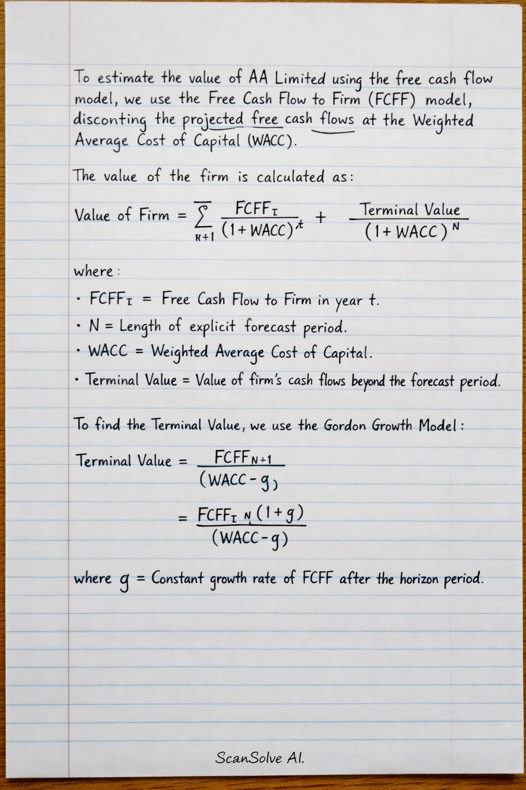 To estimate the value of AA Limited using the free cash flow model, we typically use the Free Cash Flow to Firm (FCFF) model, which discounts the projected free cash flows to the firm at the Weighted Average Cost of Capital (WACC).