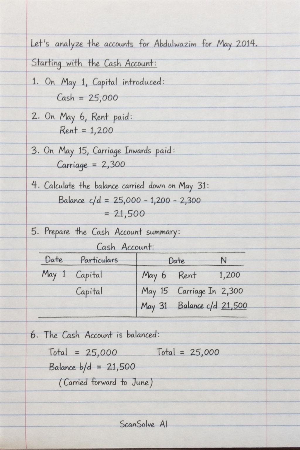 | Date | Particulars | N | Date | Particulars | N | | :------ | :-------------- | :------- | :------ | :-------------- | :------- | | May 1 | Capital | 25,000 | May 6 | Rent | 1,200 | | | | | May 15 | Carriage Inwards| 2,300 | | | | | May 31 | Balance c/d | 21,5