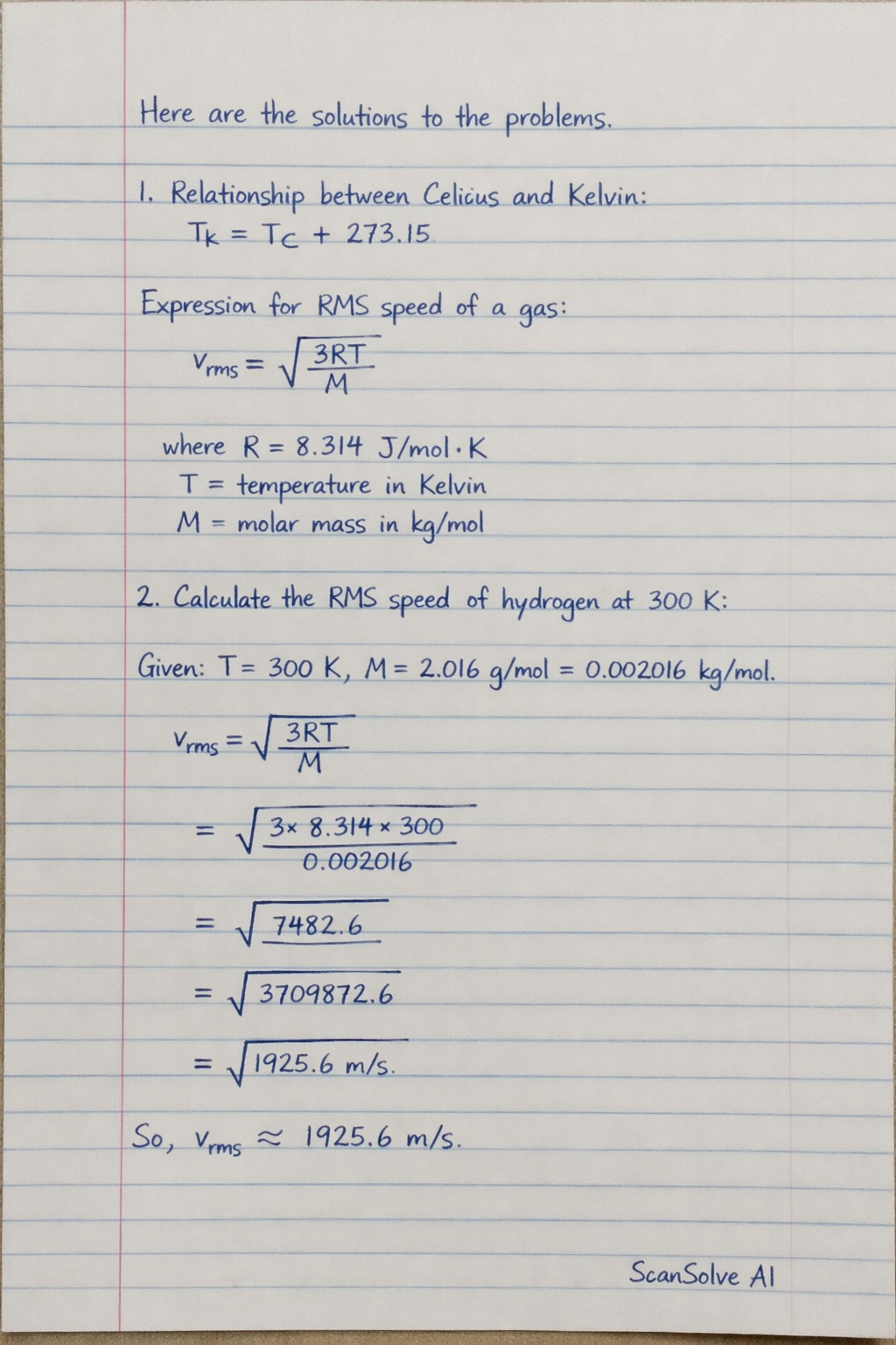 2. Calculate the root mean square speed of hydrogen molecule at 300K (molar mass of hydrogen is 2.016 g/mol, R = 8.314 J mol⁻¹ K⁻¹).