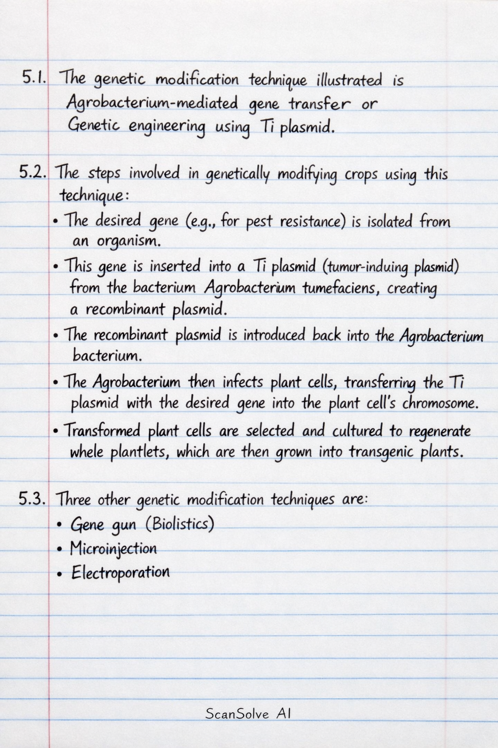5.2. The steps involved in genetically modifying crops using this technique are: • The desired gene (e.g., for pest resistance) is isolated from an organism. • This gene is inserted into a Ti plasmid (tumor-inducing plasmid) from the bacterium Agrobacterium tumefaciens, creating a recombinant plasmid. • The recombinant plasmid is introduced back into the Agrobacterium bacterium. • The Agrobacterium then infects plant cells, transferring the Ti plasmid with the desired gene into the plant cell's chromosome. • Transformed plant cells are selected and cultured to regenerate whole plantlets, which are then grown into transgenic plants.