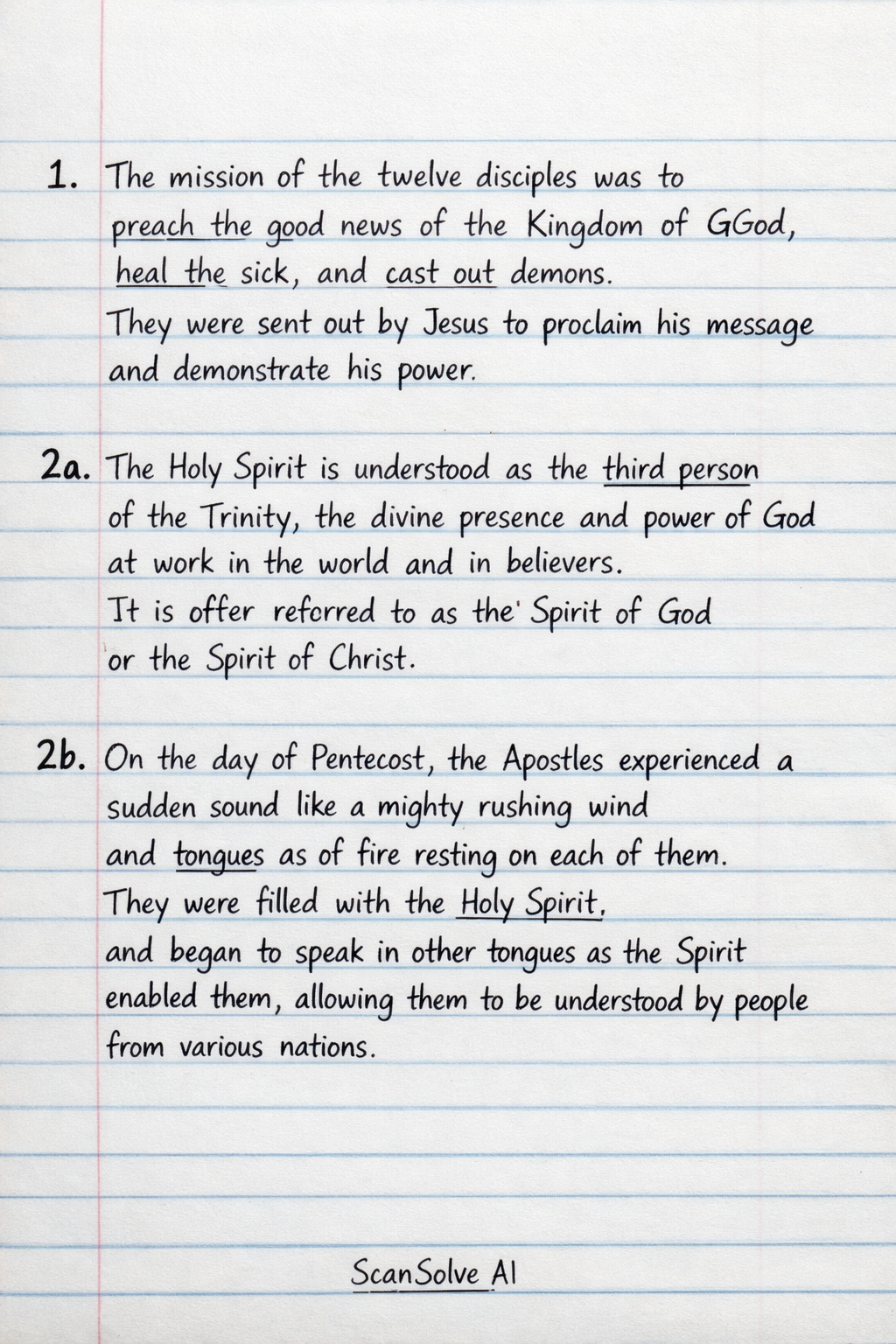 2a. The Holy Spirit is understood as the third person of the Trinity, the divine presence and power of God at work in the world and in believers. It is often referred to as the Spirit of God or the Spirit of Christ.