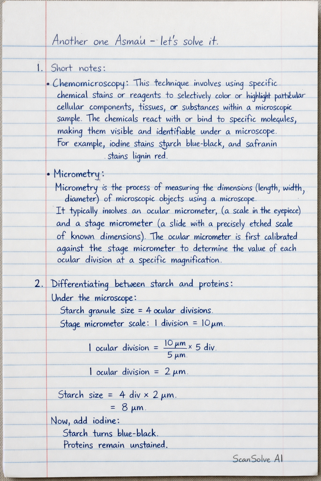 Chemomicroscopy*: This technique involves using specific chemical stains or reagents to selectively color or highlight particular cellular components, tissues, or substances within a microscopic sample. The chemicals react with or bind to specific molecules, making them visible and identifiable under a microscope. For example, iodine stains starch blue-black, and safranin stains lignin red.