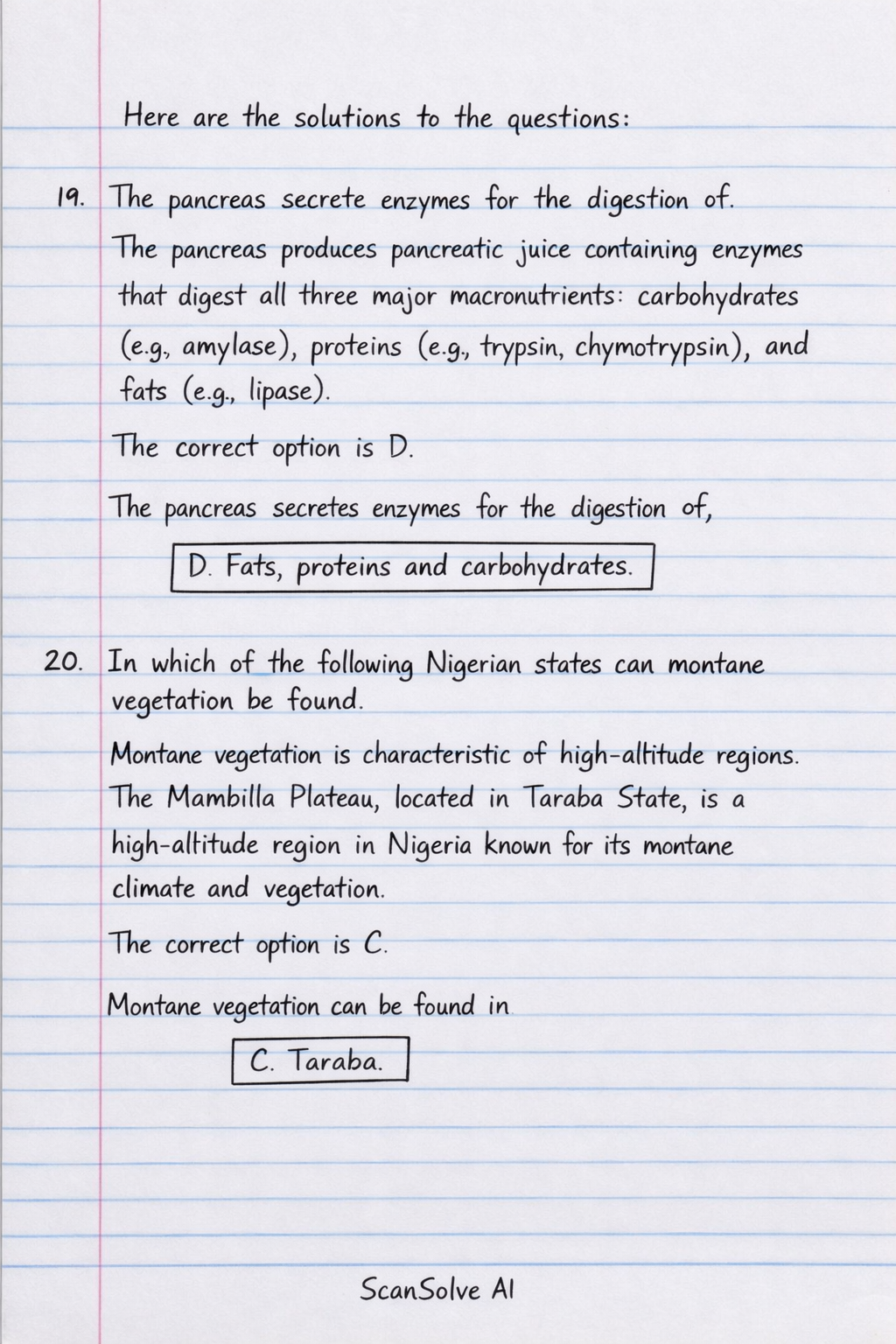 19. The pancreas secrete enzymes for the digestion of