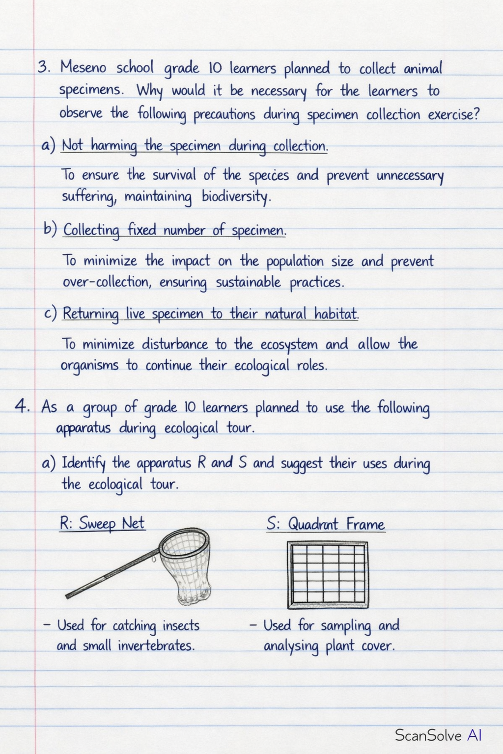 - Meseno school grade 10 learners planned to collect animal specimens. Why would it be necessary for the learners to observe the following precautions during specimen collection exercise?