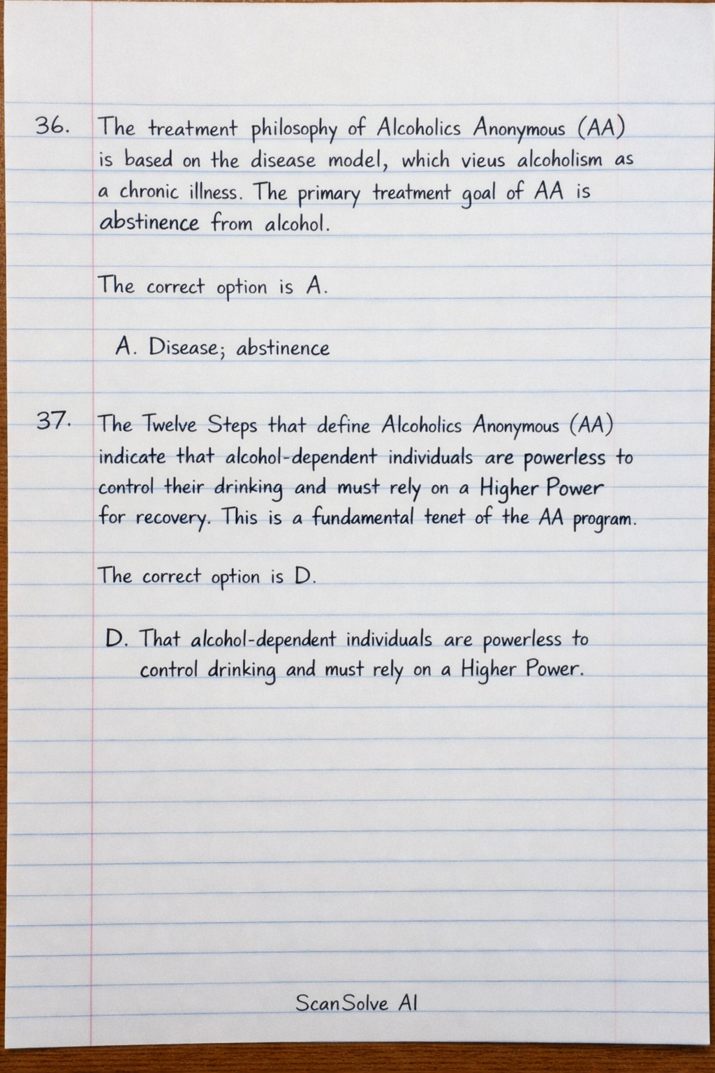 36. The treatment philosophy of Alcoholics Anonymous (AA) is based on the disease model, which views alcoholism as a chronic illness. The primary treatment goal of AA is abstinence from alcohol.