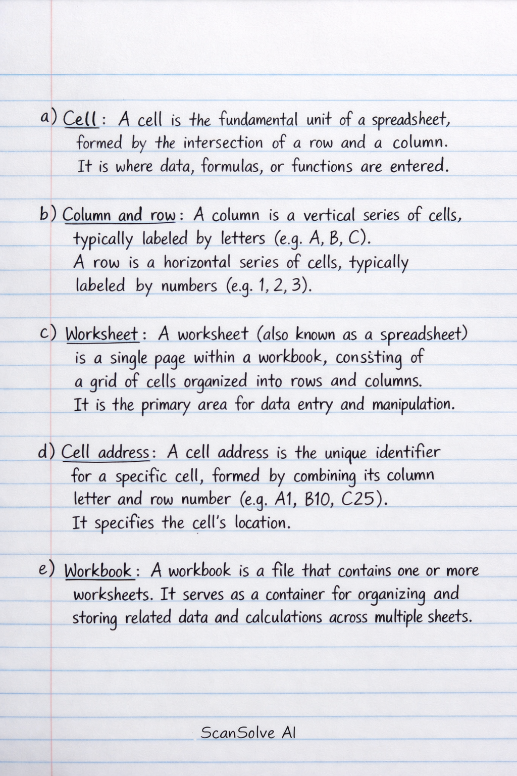1. Every organization has a strategic level. Explain this level and the most advised type of management information system to be adopted (10 marks) 2. With a simple ring diagram. Discuss the data processing cycle in business management (10 marks) 3. Outline the following terms as used in spreadsheet (10 mark) a. Cell b. Column and row c. Worksheet d. Cell address e. workbook