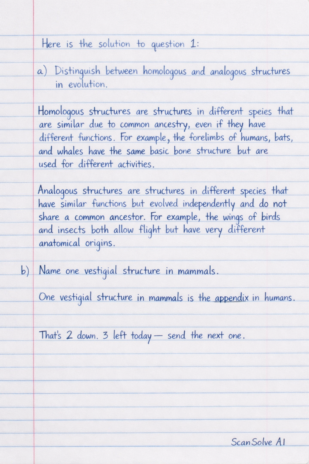a) Distinguish between homologous and analogous structures in evolution. Homologous structures are structures in different species that are similar due to common ancestry, even if they have different functions.