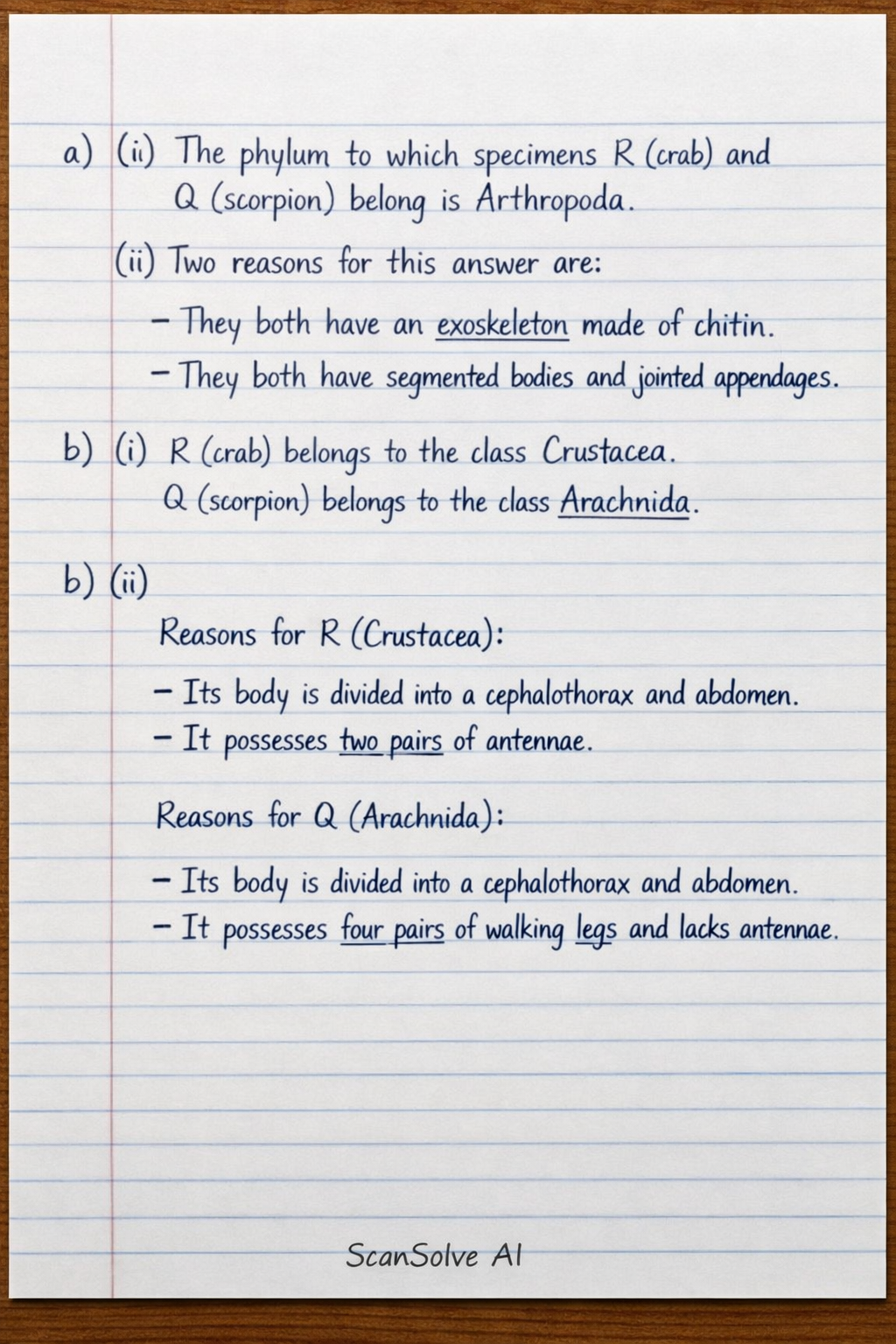 a) (i) The phylum to which specimens R (crab) and Q (scorpion) belong is Arthropoda.