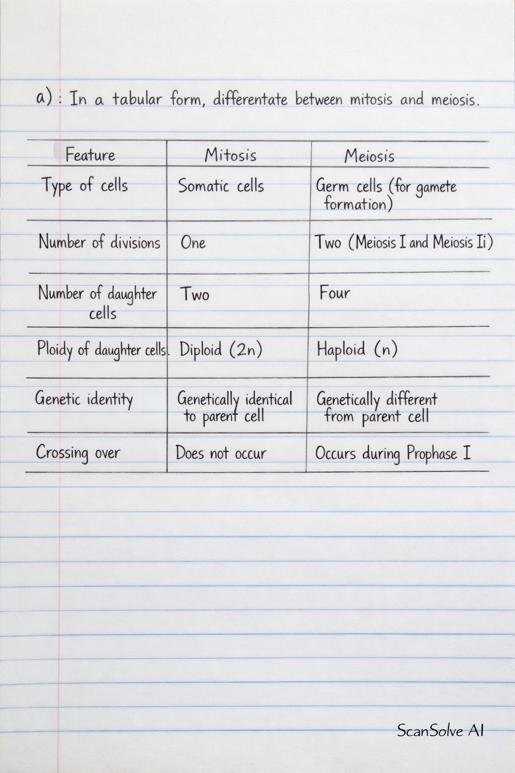 a) In a tabular form, differentiate between mitosis and meiosis.