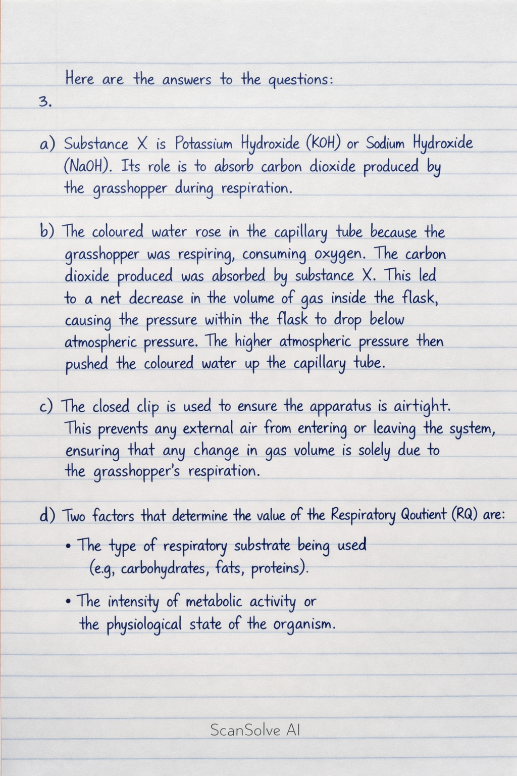 b) The coloured water rose in the capillary tube because the grasshopper was respiring, consuming oxygen. The carbon dioxide produced was absorbed by substance X. This led to a net decrease in the volume of gas inside the flask, causing the pressure within the flask to drop below atmospheric pressure. The higher atmospheric pressure then pushed the coloured water up the capillary tube.