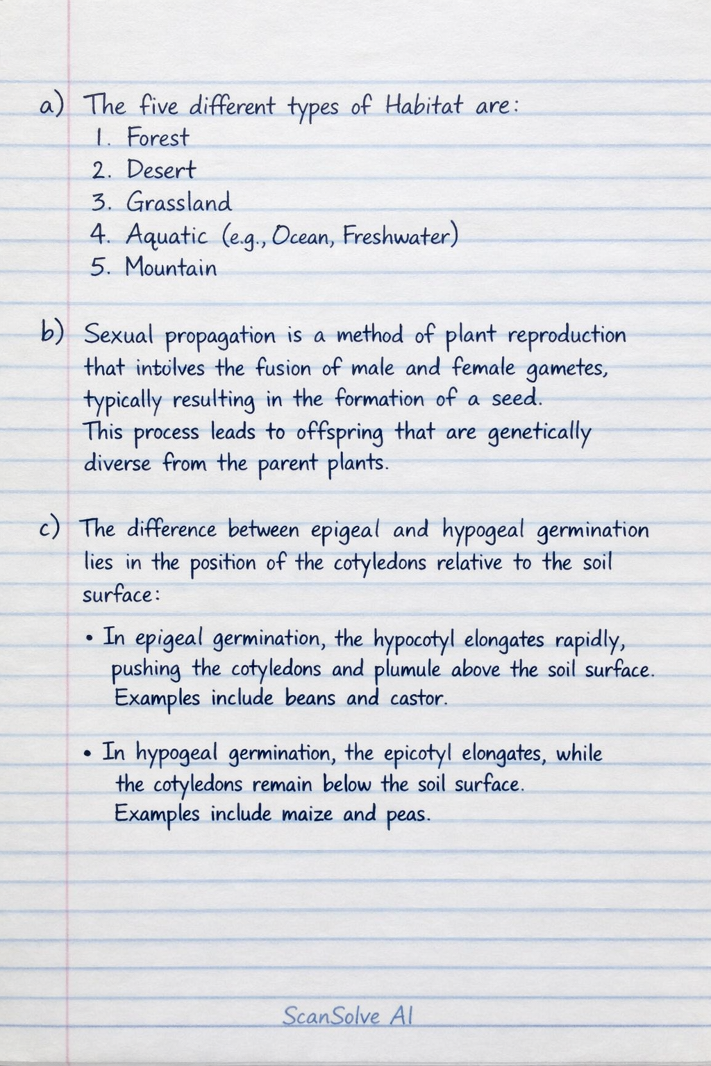 c) The difference between epigeal and hypogeal germination lies in the position of the cotyledons relative to the soil surface: • In epigeal germination, the hypocotyl elongates rapidly, pushing the cotyledons and plumule above the soil surface. Examples include beans and castor. • In hypogeal germination, the epicotyl elongates, while the cotyledons remain below the soil surface. Examples include maize and peas.