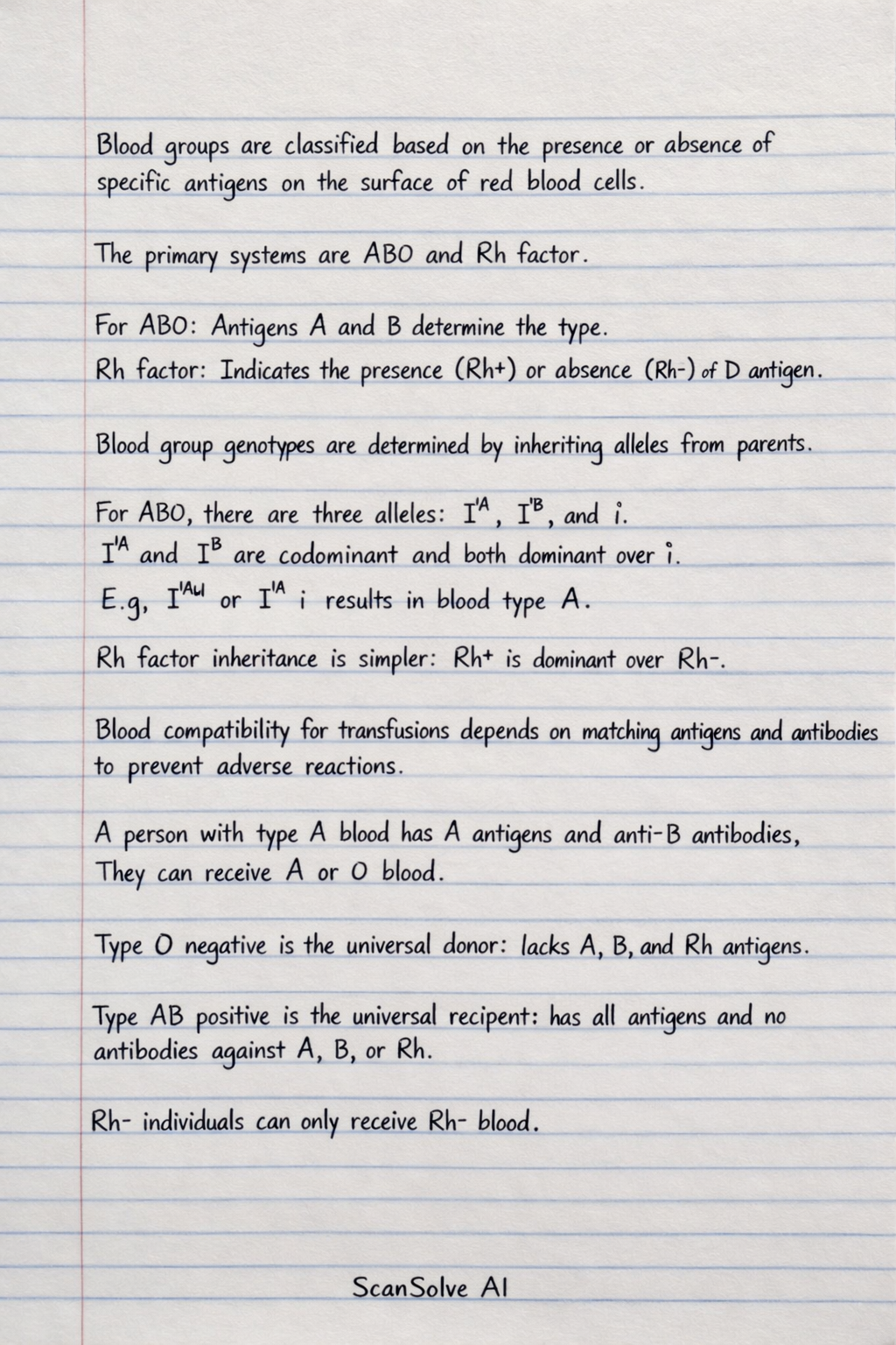 Blood group genotypes are determined by inheriting alleles from parents. For ABO, there are three alleles: , , and . and are codominant and both are dominant over . For example, genotype or results in blood type A. Rh factor inheritance is simpler, with Rh+ being dominant over Rh-.