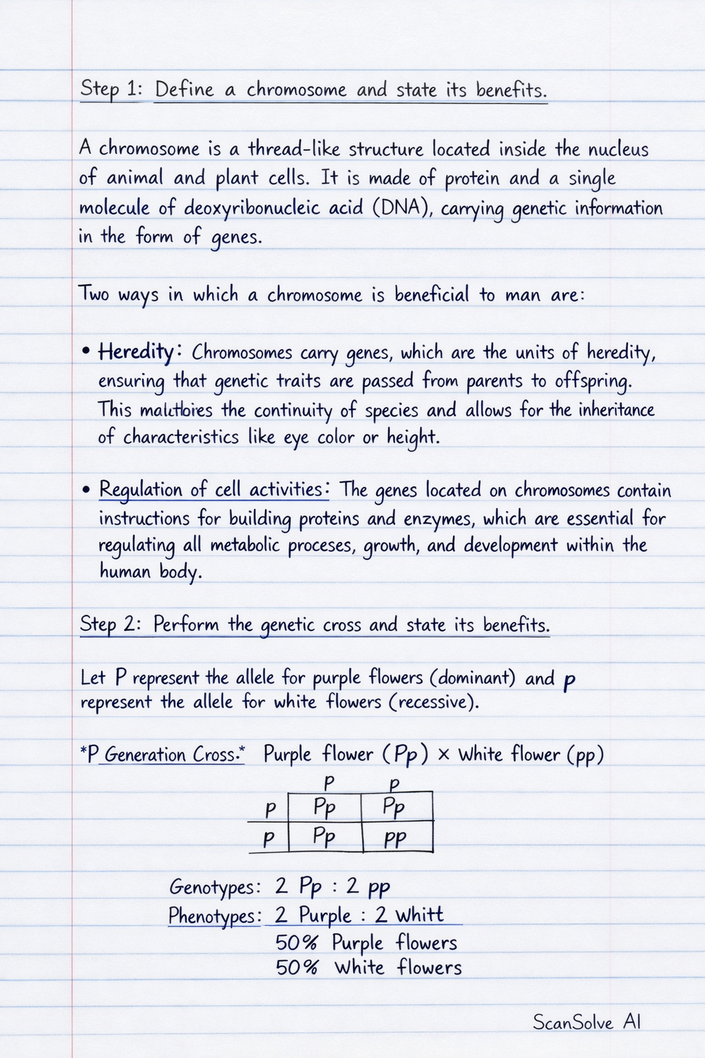 Step 1: Define a chromosome and state its benefits. A chromosome is a thread-like structure located inside the nucleus of animal and plant cells. It is made of protein and a single molecule of deoxyribonucleic acid (DNA), carrying genetic information in the form of genes.