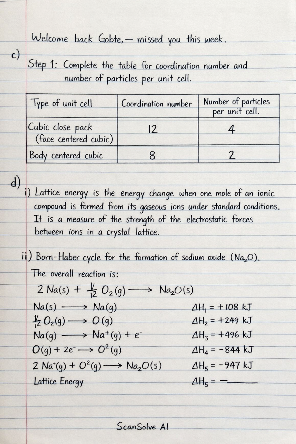 d)i) Lattice energy is the energy change when one mole of an ionic compound is formed from its gaseous ions under standard conditions. It is a measure of the strength of the electrostatic forces between ions in a crystal lattice.