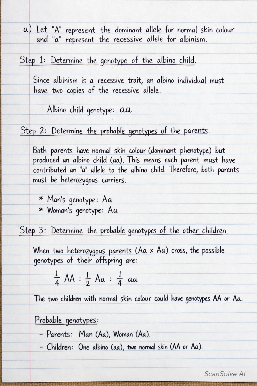 Verified3 stepsYou're on a roll — a) Let 'A' represent the dominant allele for normal skin colour and 'a' represent the recessive allele for albinism.