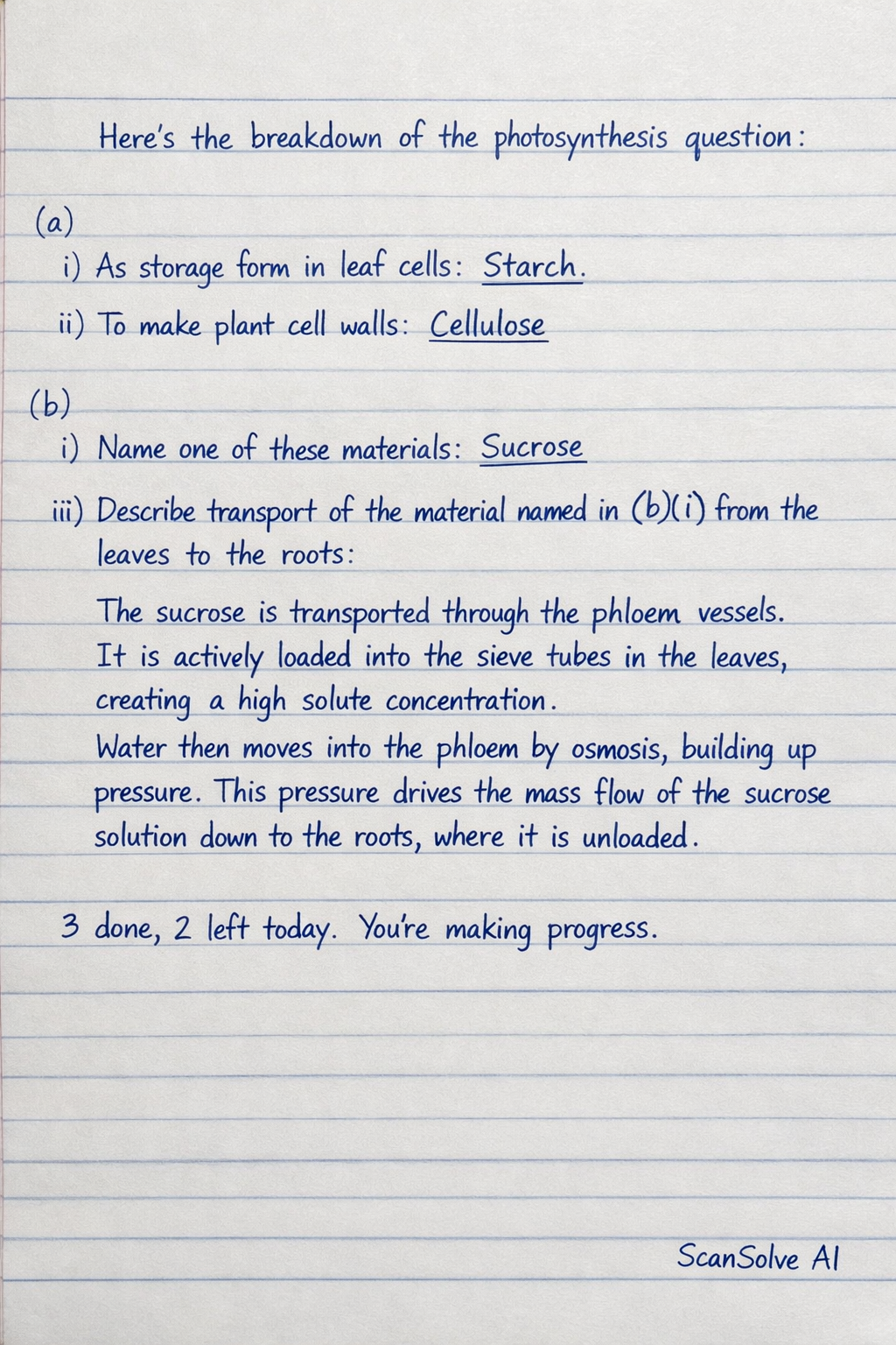 b) i) Name one of these materials: Sucrose ii) Describe transport of the material named in (b)(i) from the leaves to the roots. The sucrose is transported through the phloem vessels. It is actively loaded into the sieve tubes in the leaves, creating a high solute concentration. Water then moves into the phloem by osmosis, building up pressure. This pressure drives the mass flow of the sucrose solution down to the roots, where it is unloaded.