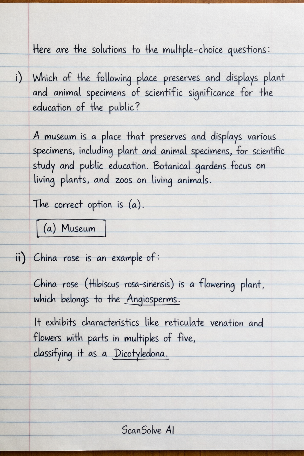 China rose (Hibiscus rosa-sinensis) is a flowering plant, which belongs to the Angiosperms. It exhibits characteristics like reticulate venation and flowers with parts in multiples of five, classifying it as a *Dicotyledona