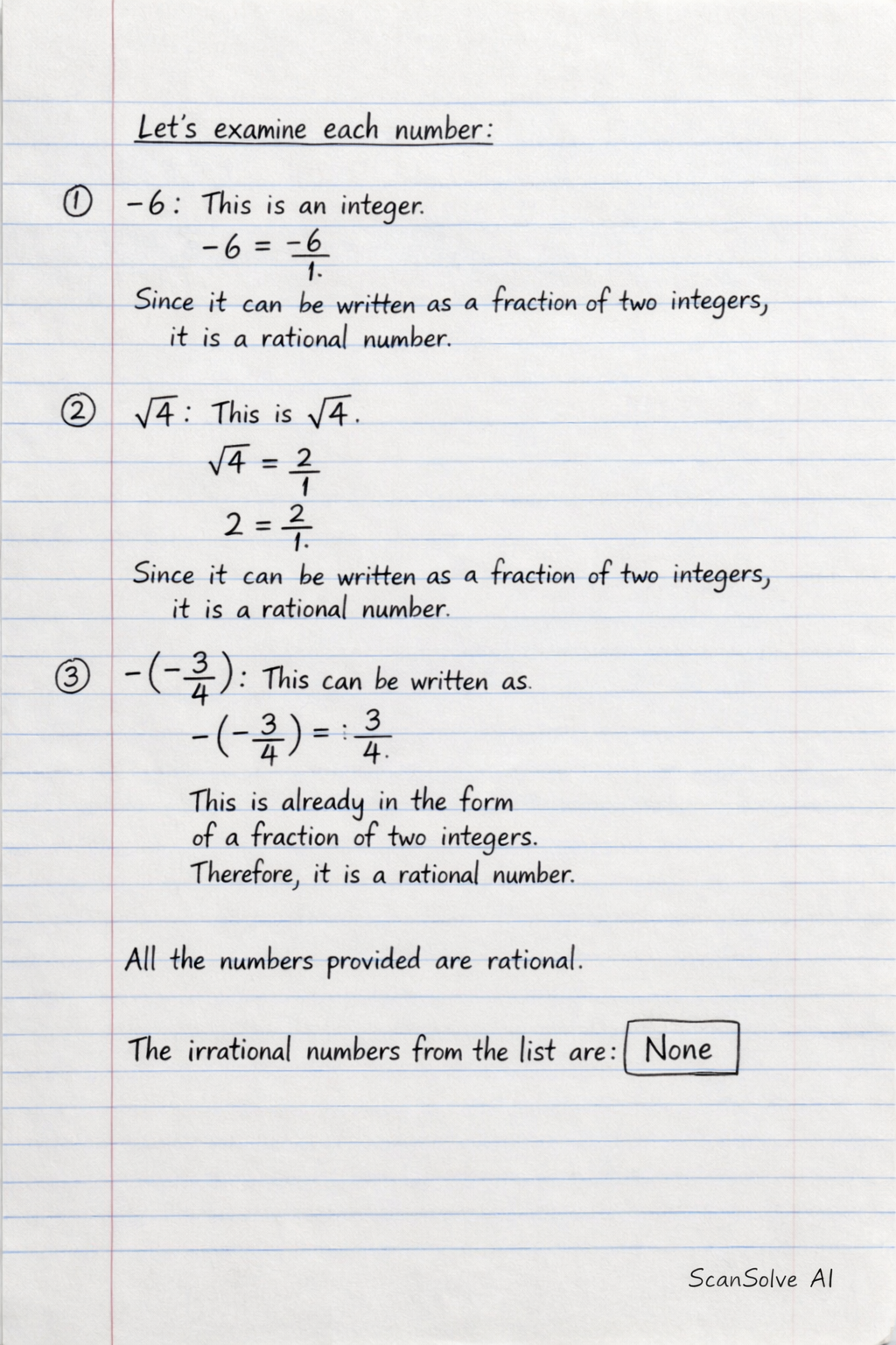 -6: This is an integer. It can be written as 1−6. Since it can be expressed as a fraction of two integers, it is a rational number.