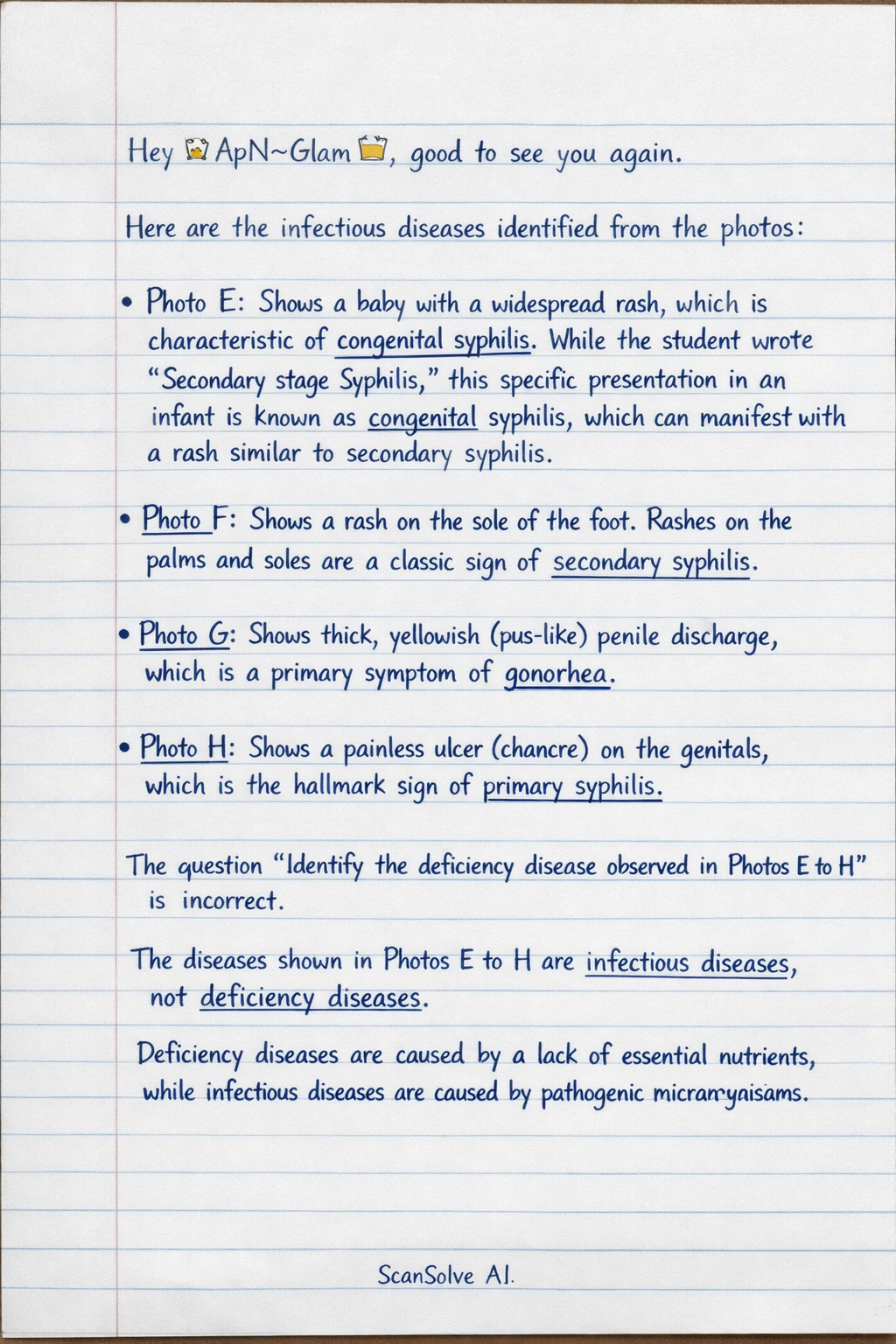 The question "Identify the deficiency disease observed in Photos E to H" is incorrect. The diseases shown in Photos E to H are infectious diseases, not deficiency diseases. Deficiency diseases are caused by a lack of essential nutrients, while infectious diseases are caused by pathogenic microorganisms.