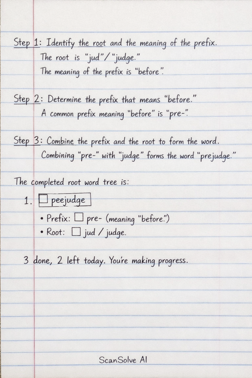 Step 3: Combine the prefix and the root to form the word. Combining "pre-" with "judge" forms the word "prejudge".