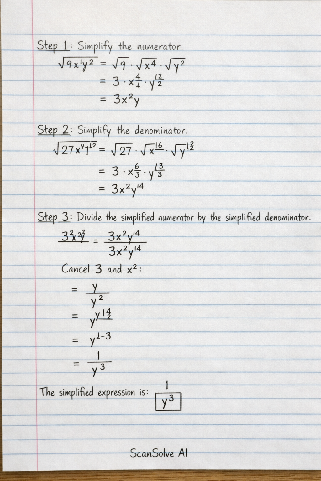 Step 3: Divide the simplified numerator by the simplified denominator. Now, substitute the simplified expressions back into the fraction: Cancel out the common terms and : Using the rule of exponents : This can also be written as: