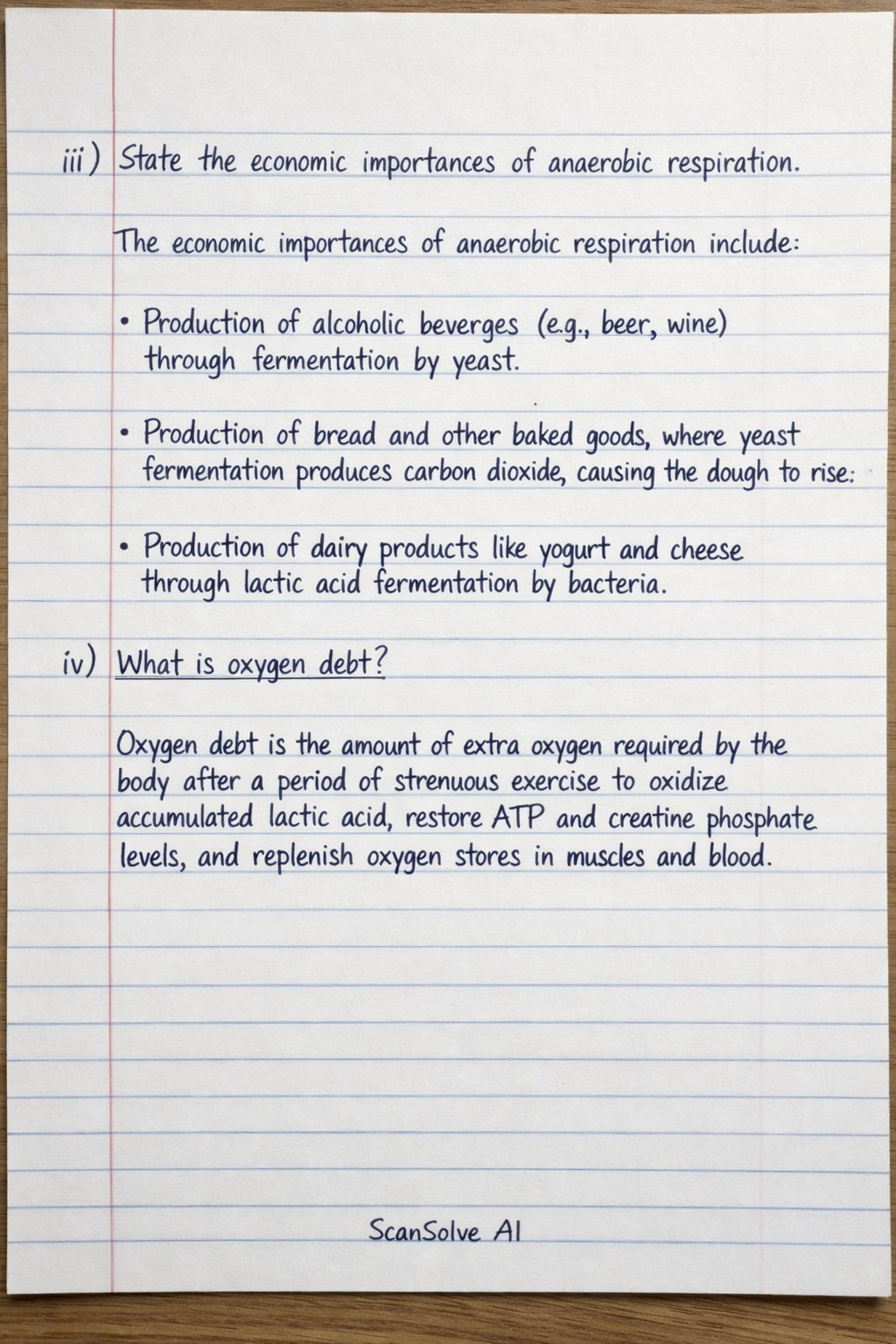 iii) State the economic importances of anaerobic respiration. The economic importances of anaerobic respiration include: • Production of alcoholic beverages (e.g., beer, wine) through fermentation by yeast. • Production of bread and other baked goods, where yeast fermentation produces carbon dioxide, causing the dough to rise. • Production of dairy products like yogurt and cheese through lactic acid fermentation by bacteria.