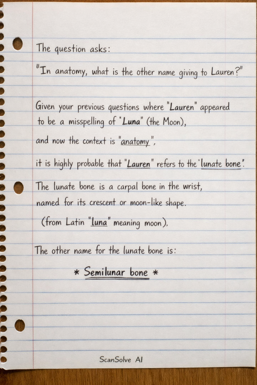Given your previous questions where "Lauren" appeared to be a misspelling of "Luna" (the Moon), and now the context is "anatomy," it is highly probable that "Lauren" refers to the lunate bone. The lunate bone is a carpal bone in the wrist, named for its crescent or moon-like shape (from Latin luna meaning moon).