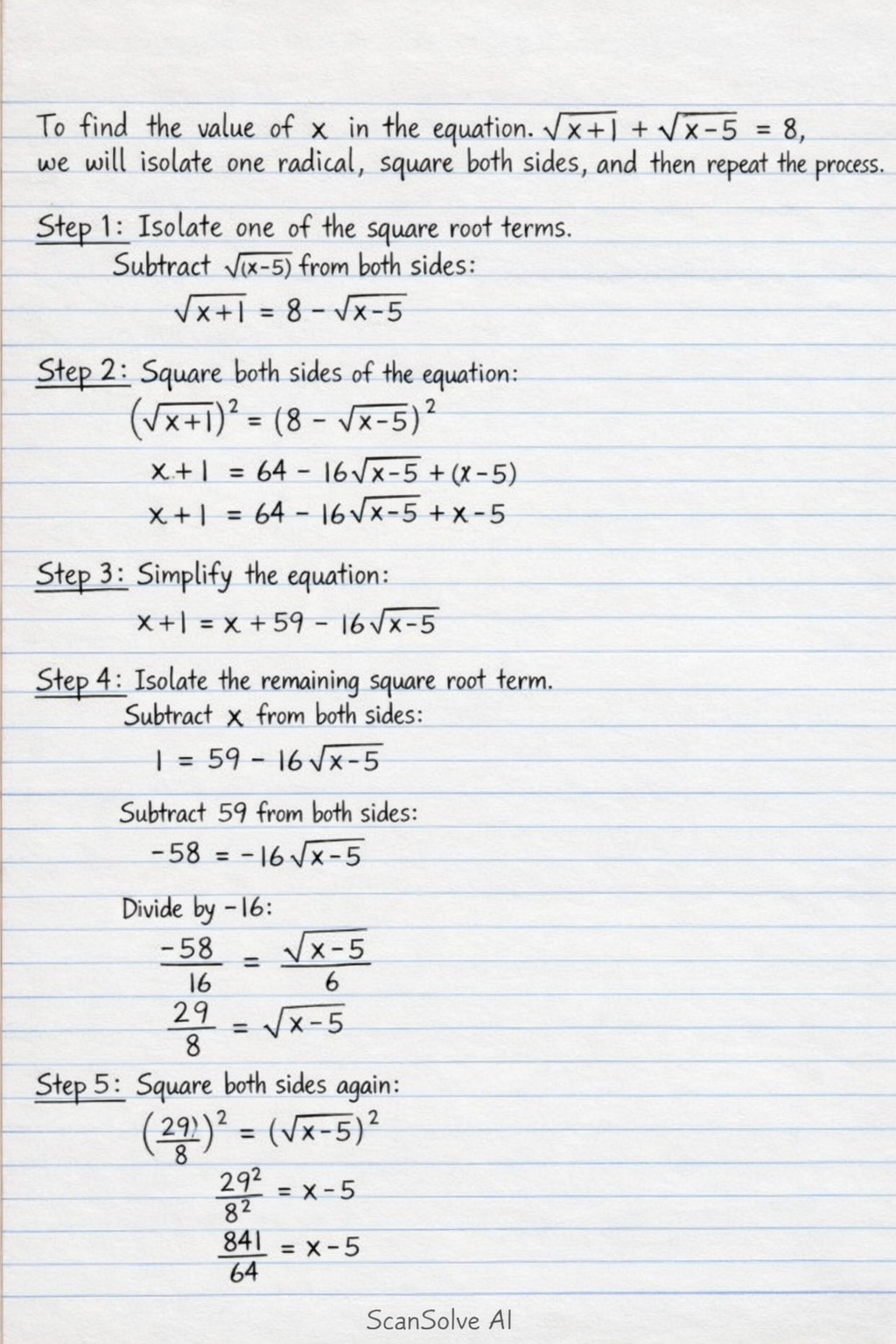 Step 1: Isolate one of the square root terms. Subtract from both sides: