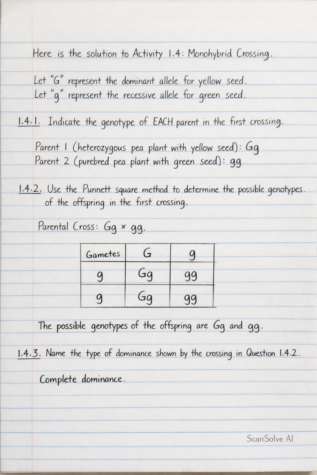 1.4.4. Explain a reason for the type of dominance in QUESTION 1.4.3. In complete dominance, the heterozygous genotype (Gg) expresses the same phenotype (yellow seed) as the homozygous dominant genotype (GG). The dominant allele (G) completely masks the expression of the recessive allele (g).