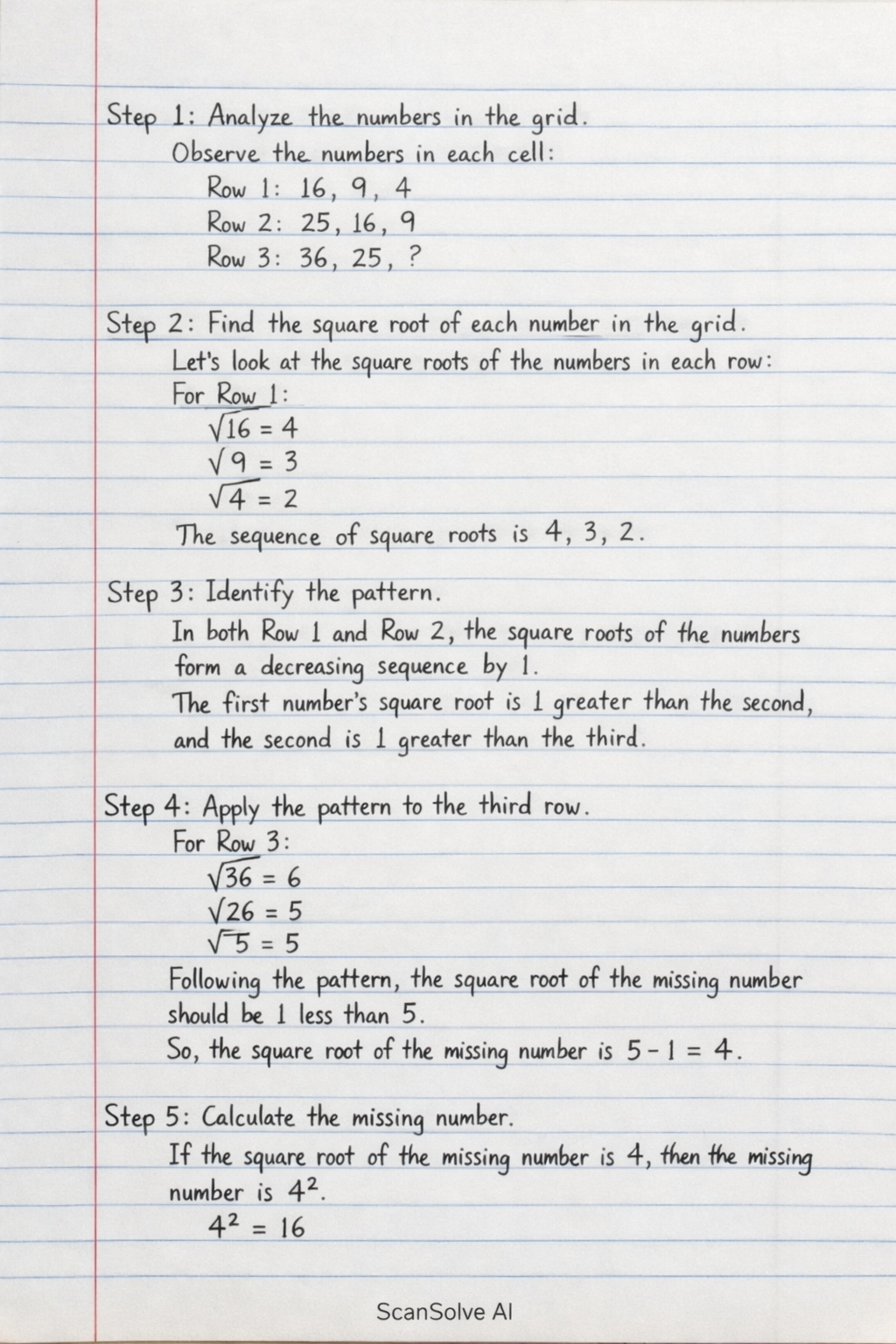 Analyze the numbers in the grid. Observe the numbers in each cell: Row 1: 16, 9, 4 Row 2: 25, 16, 9 Row 3: 36, 25, ? Step 2: Find the square root of each number in the grid.