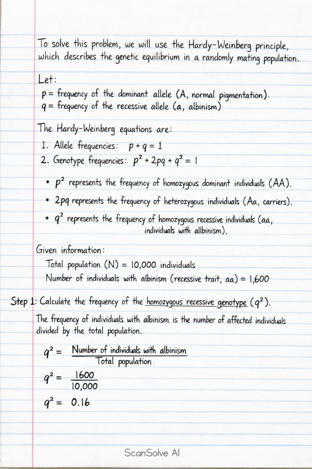 Step 1: Calculate the frequency of the homozygous recessive genotype (). The frequency of individuals with albinism is the number of affected individuals divided by the total population.