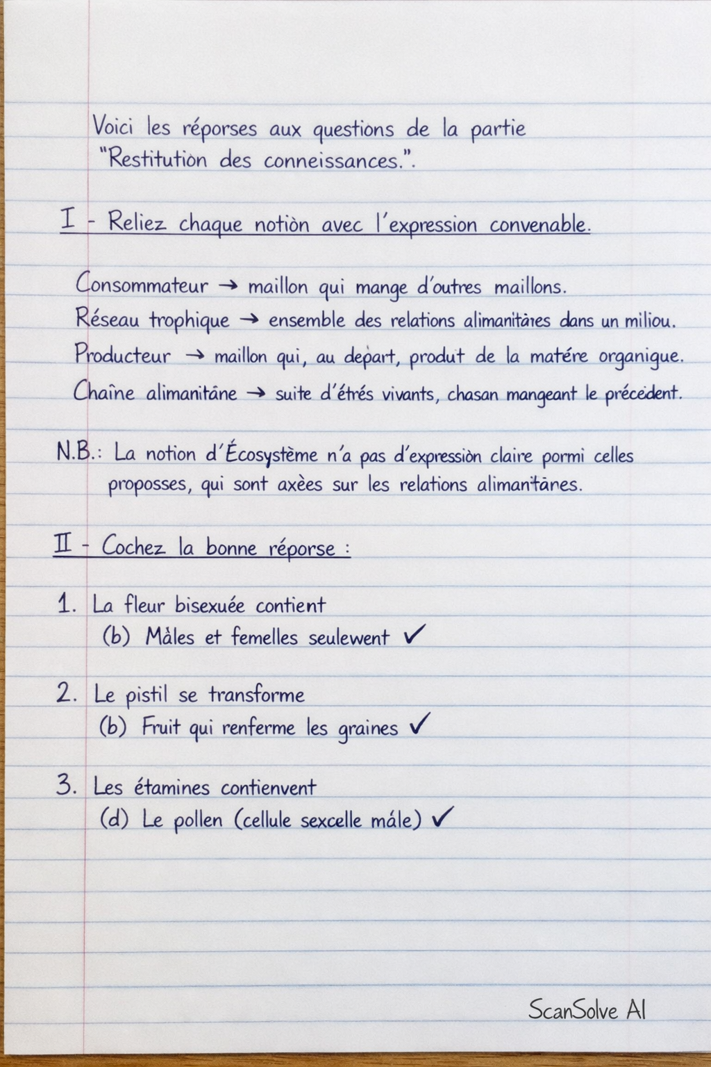 Partie 1: Restitution des connaissances ( 1-Reliez chaque notion avec l'expression convenable Mots ensemble des relations simetres fans on Expressionsrps -Consommateur, écosystème suite d'étres vivantschac 2-réseau trophique, mangeut tou mang maillon qut 3-producteur, , dans une chaine noumt de matière orgunique maillon qui, au départ recharge 4-chaine alimentaire II- Cochez la bonne réponse : les élémer matière organique à partir de (3pts) 1- La fleur bisexuée contient al Fruit qui renferme les ves a) Måles seulement 2- Le pistil se transforme b) Måles et femelles seulement b) Fruit qui renferme les graines c) Fruit qui renferme less de pollen c) Femelles seulement d) Fruit qui renferme le picti d) Aucun des deux 4- Le pistil renferme a) Les ovules (cellules seves b) Les ovules (cellules lamelles 3- Les étamines contiennent femelles). a) Les ovules (cellules sexuelles b) Les ovules (cellules sexuelles mai c) Le pollen (cellule sexuelle femelle c) Le pollen (cellule d) Le pollen cele seni d) Le pollen (cellule sexuelle måle) 6-Une reproduction sexuée lat aj Des cellules sexuelles miles et n cellules sexuelles temeles 5- La Pollinisation c'est a) Le déplacement du pollen vers le pistil de la fleur. Seulement le pollen jullie male) c) Seulement les ovules (celles sexuelles temelles) b ) Le déplacement et la rencontre dub) pistil c) Le déplacement et la rencontre des étamines d ) Le déplacement et la rencontre des ovules anthérozoides
