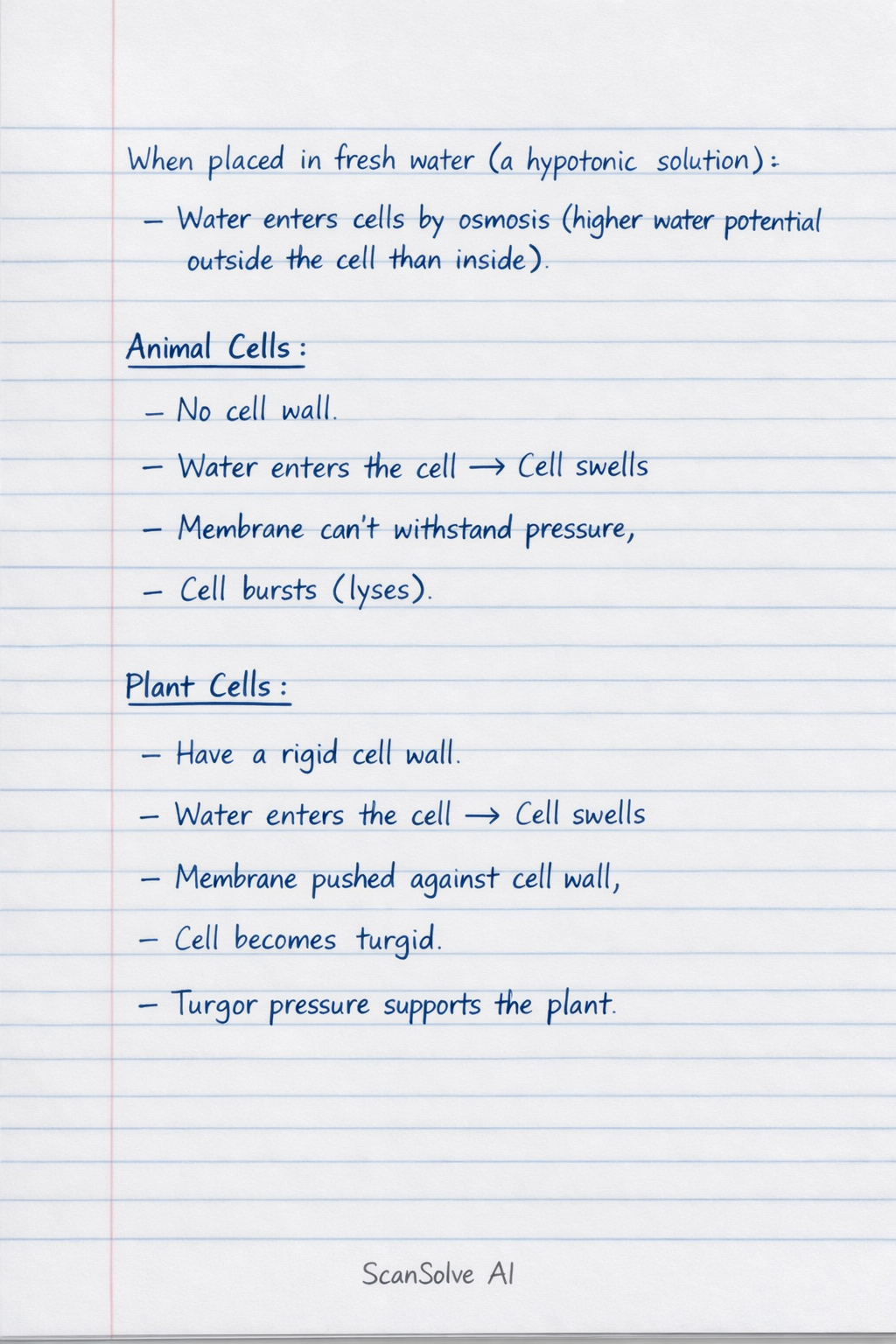 When placed in fresh water (a hypotonic solution), both plant and animal cells take in water by osmosis because the water potential outside the cell is higher than inside. However, they behave differe