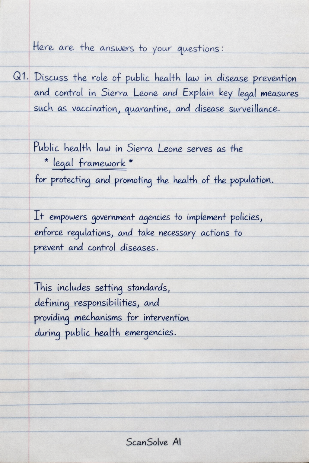 Q1. Discuss the role of public health law in disease prevention and control in Sierra Leone and Explain key legal measures such as vaccination, quarantine, and disease surveillance.